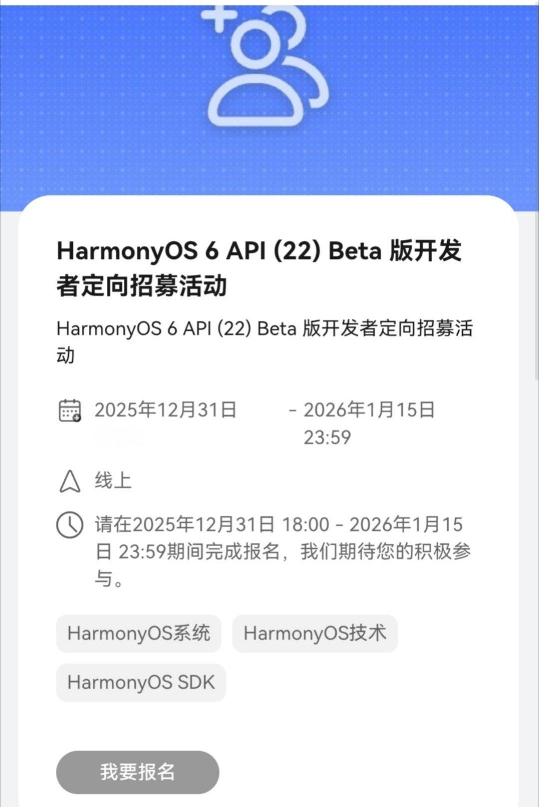 【华为鸿蒙 HarmonyOS 6 API (22) Beta 版开发者定向招募 12 月 31 日报名】华为上线 HarmonyOS 6 API (22) Beta 版开发者定向招募活动,报名时间为 2025 年 12 月 31 日~2026 年 1 月 15 日 18:00。据官方介绍,HarmonyOS 6 API (22) Beta 版是在 HarmonyOS 6 API (22) 正式版本发布前,为更全面地验证产品的功能以及保障产品的质量、提升用户体验,在现网环境下招募开发者参与开发体验的测试版本,您可以体验到 HarmonyOS 的更多新功能、新特性以及使用 DevEco Studio 进行应用开发时的便捷与高效。据IT之家此前报道,华为鸿蒙开发者官网在 11 月 7 日发布了 HarmonyOS 6.0.1 (21) Beta 版本说明。HarmonyOS 6.0.1 (21) Beta1 在 6.0.0 (20) Release 的基础上:进一步增强 ArkUI 组件能力,新增一批属性样式的 C API,增强了 Image 组件的 SVG 解析能力;Ability Kit 增强了拉起应用的结果处理;ArkWeb 增强了 WebView 相关能力;后台任务新增支持并行创建多个同样的长时任务;地图服务进一步丰富了可直接调用的场景,等等