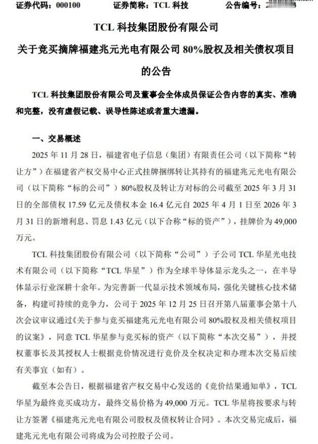 【TCL 华星光电 4.9 亿元收购兆元光电 80% 股权,正式涉足 LED 芯片领域】TCL 科技发布公告,旗下 TCL 华星光电技术有限公司以 4.9 亿元成功竞买福建省电子信息(集团)有限责任公司持有的福建兆元光电有限公司 80% 股权及相关债权,正式涉足 LED 芯片领域。此次交易旨在完善 TCL 华星在新一代显示技术领域的布局,交易完成后,福建兆元光电有限公司将成为公司控股子公司。本次参与竞买摘牌旨在实现 TCL 华星自主掌握 LED 芯片设计与制造环节,打造 LED 芯片到显示模组的全产业链垂直整合,构建自主可控的供应链体系。LED 芯片作为显示与照明技术的核心基础材料,其性能直接决定了终端显示产品的画质表现、能效水平及可靠性。基于企业长远发展规划,公司通过进军 LED 芯片业务实现向上游产业链延伸,打通关键环节的供应壁垒,实现核心资源的自主可控,并逐步挖潜提升产业链一体化价值。本次交易完成后,一方面,TCL 华星将基于标的公司现有资产和业务基础加快推进 LED 垂直产业链体系的搭建与整合,加速 TCL 华星 Mini / Micro LED 高端显示技术进程及其在高端电视、商用大屏、车载显示等高质量新型显示场景的产业化应用;另一方面,TCL 华星将在制造、技术、市场等方面充分赋能,协同公司直显、车载及背光等现有业务和技术资源,导入大客户资源,提高产品竞争力和规模效应,改善其盈利水平。本次交易不会对公司财务状况造成较大影响。本次交易系打造 TCL 华星 LED 芯片到显示模组的全产业链垂直整合的关键举措。随着标的公司生产效率的系统性优化提升、规模化效应的逐步释放,TCL 华星将进一步丰富多元化产品矩阵,全面提升在高性能、全场景显示解决方案的核心竞争力,持续巩固行业领先地位,提升公司效率效益。此前,TCL 科技旗下 TCL 华星已与国内 LED 芯片龙头企业三安光电进行战略合作,在厦门合资设立芯颖公司,完成 Micro LED 中试线建设。福建兆元光电有限公司成立于 2011 年,主要专注于 LED 外延片、LED 芯片的研发、生产和销售,拥有完整的 LED 芯片生产线、规模产能和业务基础,在背光、Mini LED 直显、车载照明等高价值领域已达到行业领先水平。