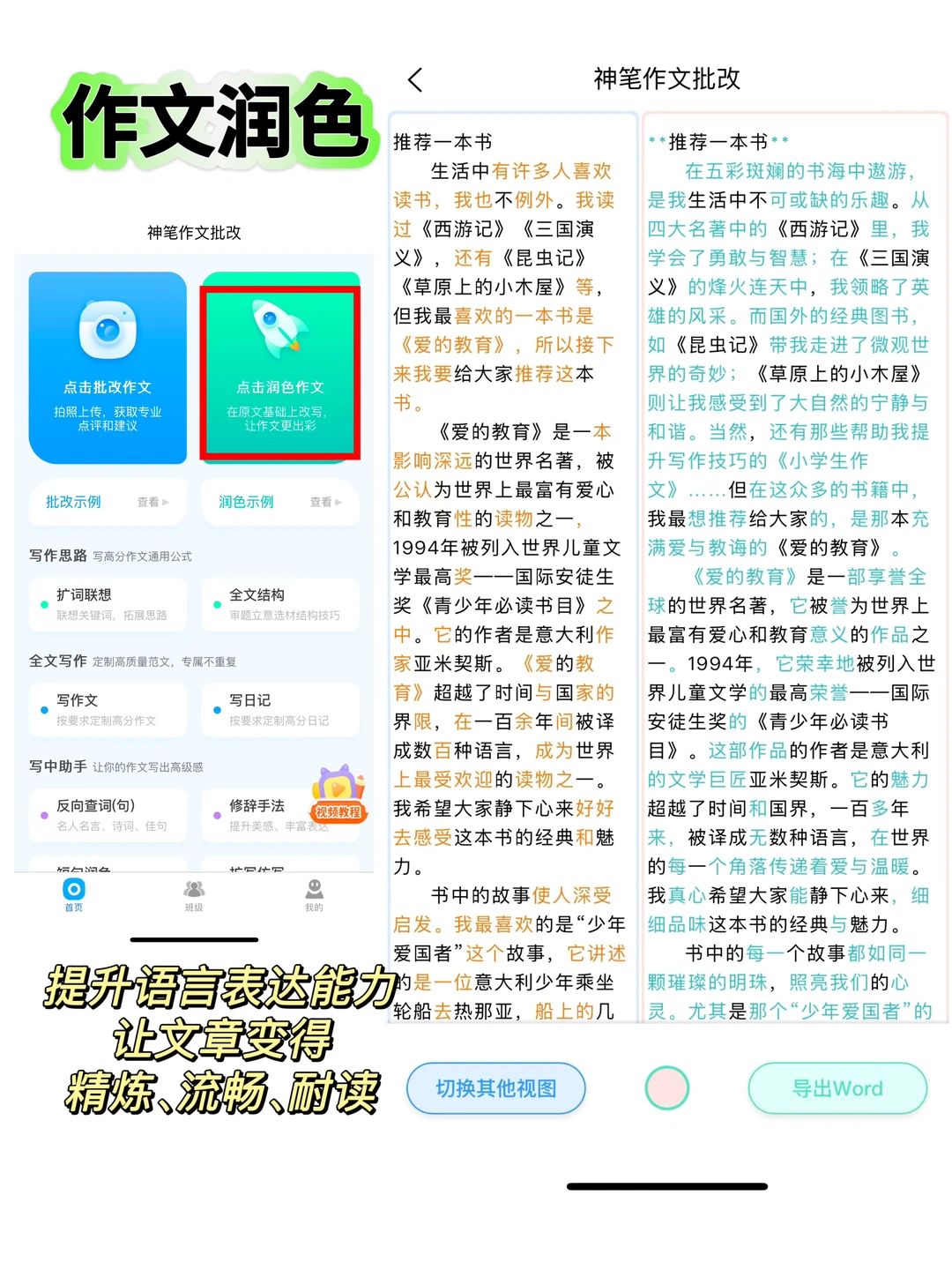 ✨对于学生而言,这是一款可以提升写作能力的智能应用。个性化的指导,让孩子的写作水平稳步提升,帮助他们在文字的海洋中畅游无阻!