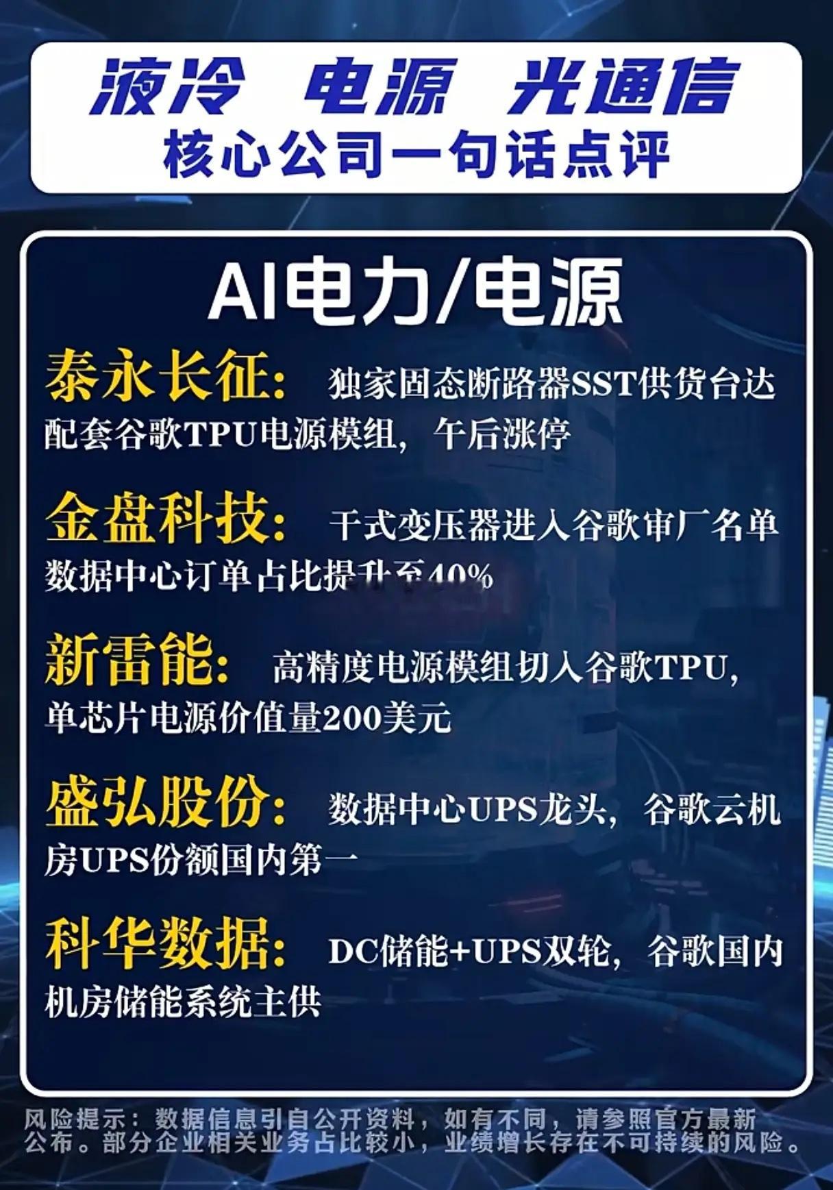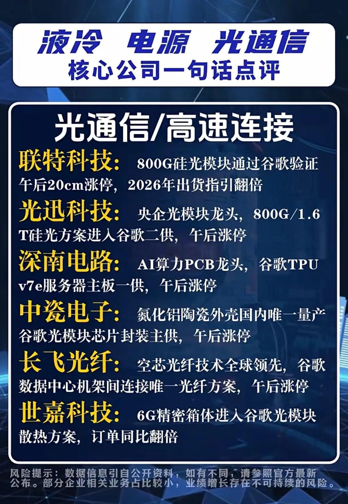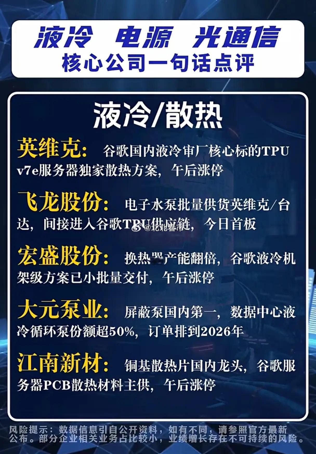 液冷+电源+光通信集体爆发,谁是谷歌产业链真龙头?当AI算力需求呈指数级增长,数据中心的“散热、供电、传输”三大核心难题成为行业破局关键,而谷歌TPU v7e服务器的落地,竟让A股液冷、电源、光通信赛道迎来集体狂欢,究竟哪些企业真正站在了谷歌产业链的核心位置?液冷散热领域,英维克凭借谷歌国内液冷审厂核心标的身份,拿下TPU v7e服务器独家散热方案,午后直线涨停的表现印证了市场认可度;飞龙股份的电子水泵批量供货英维克与台达,间接切入谷歌TPU供应链,成功收获首板;宏盛股份的换热器产能翻倍,谷歌液冷机架级方案已小批量交付,大元泵业的屏蔽泵在数据中心液冷循环泵市场份额超50%,订单排至2026年,江南新材作为铜基散热片龙头,更是谷歌服务器PCB散热材料主供,这些企业用实打实的供应链地位,撑起了液冷赛道的热度。AI电力/电源板块同样看点十足,泰永长征的固态断路器SST独家供货台达,配套谷歌TPU电源模组,午后涨停彰显硬实力;金盘科技的干式变压器进入谷歌审厂名单,数据中心订单占比提升至40%;新雷能的高精度电源模组切入谷歌TPU,单芯片电源价值量达200美元,盛弘股份与科华数据则分别在UPS与储能系统领域,拿下谷歌云机房的核心供应地位,电源赛道的企业用技术壁垒敲开了谷歌供应链的大门。光通信/高速连接领域的竞争更是白热化,联特科技800G硅光模块通过谷歌验证,2026年出货指引翻倍,午后20cm涨停引爆市场;光迅科技作为央企光模块龙头,800G/1.6T硅光方案成为谷歌二供,深南电路拿下谷歌TPU v7e服务器主板一供,中瓷电子的氮化铝陶瓷外壳是谷歌光模块芯片封装的唯一量产供应商,长飞光纤的空芯光纤技术全球领先,成为谷歌数据中心机架间连接的唯一光纤方案,世嘉科技的6G精密箱体切入谷歌光模块散热方案,订单同比翻倍,光通信企业用技术创新抢占了谷歌产业链的制高点。不过值得注意的是,部分企业相关业务占比较小,业绩增长存在不可持续性风险。在这场谷歌产业链的角逐中,只有真正实现技术卡位、产能落地与订单兑现的企业,才能在AI算力革命的浪潮中站稳脚跟,而市场的追捧背后,更需要理性看待企业的真实业绩支撑。