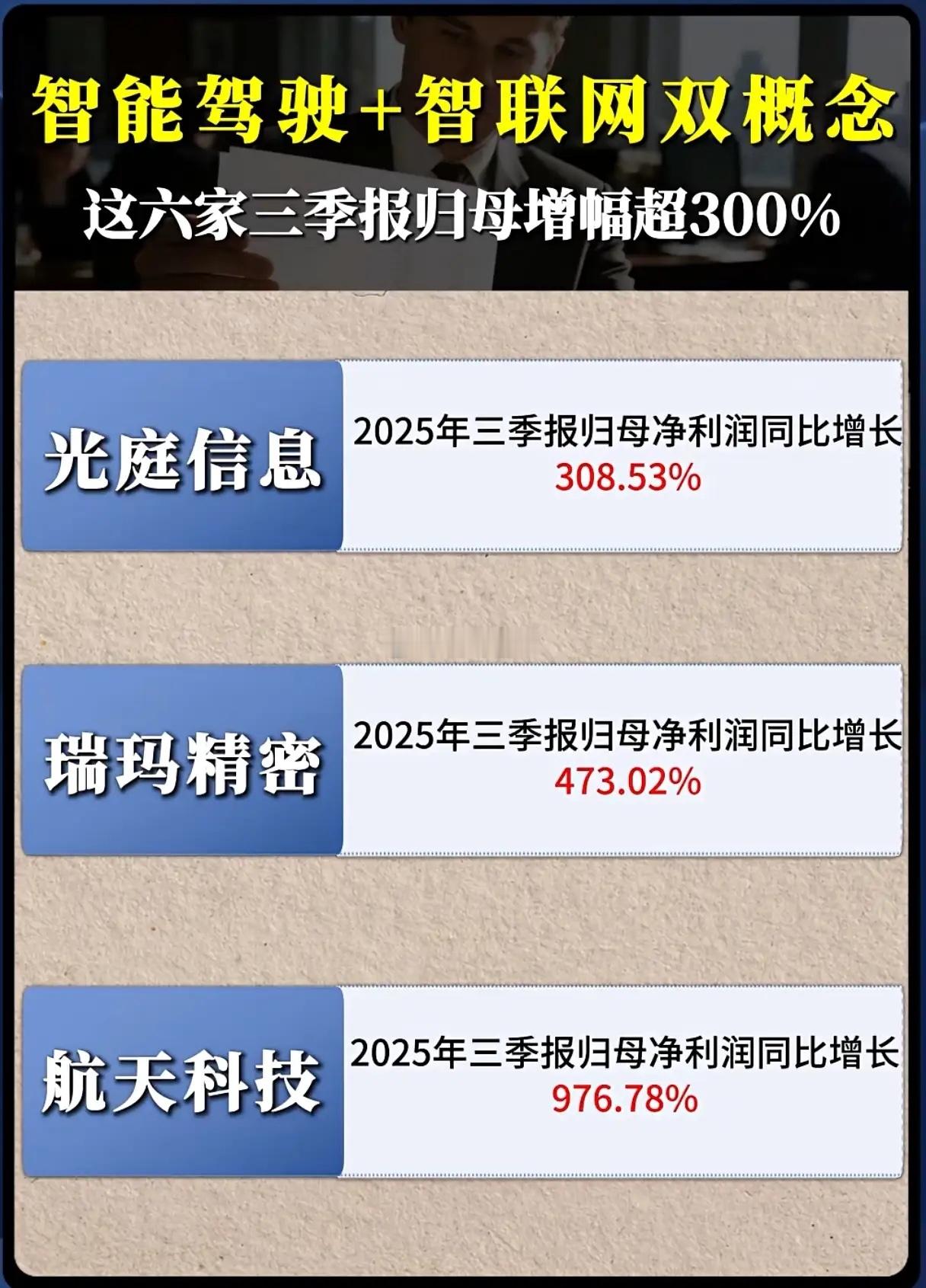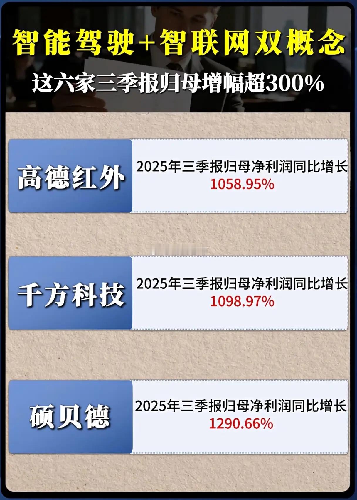智能驾驶+智联网风口下,这6家公司为何净利增幅超300%?当智能驾驶从概念走向落地,智联网技术加速渗透汽车产业,一场产业变革正悄然改写企业的盈利格局。2025年三季报披露季,六家兼具智能驾驶与智联网双概念的企业交出了惊艳答卷,归母净利润同比增幅纷纷突破300%,最高甚至超10倍,究竟是什么让它们在行业浪潮中脱颖而出?高德红外以1058.95%的净利增幅成为亮眼存在,其红外热成像技术在智能驾驶感知层的应用持续深化,车载红外摄像头的量产落地,让公司在自动驾驶安全感知领域占据了先机,军工与民用市场的双重发力,为业绩爆发筑牢了根基。千方科技的增幅更胜一筹,1098.97%的同比增长背后,是其智能交通解决方案与车路协同技术的深度融合,在城市智能交通改造和高速智慧化升级的大背景下,订单量的持续攀升直接推动了利润的暴涨。硕贝德1290.66%的增幅堪称“黑马”,这家专注于射频器件的企业,精准卡位智联网车载天线赛道,5G车载天线、毫米波雷达天线等产品的国产化替代进程加快,成为新能源车企供应链中的核心供应商,业绩增长自然水到渠成。而光庭信息以308.53%的增幅站稳脚跟,其智能座舱、车载操作系统的定制化开发服务,贴合了车企智能化升级的迫切需求,与头部新能源车企的深度合作,让公司业绩实现了跨越式增长。瑞玛精密473.02%的增长则依托于精密结构件的技术优势,车载连接器、射频器件等产品在智能驾驶域控制器、毫米波雷达中的广泛应用,使其成为产业链中不可或缺的一环。航天科技976.78%的净利增幅,得益于航天技术向民用智能驾驶领域的转化,车载导航、卫星通信模块的技术突破,让公司在车联网高精定位赛道中抢占了市场先机。在智能驾驶与智联网的双轮驱动下,这些企业的业绩爆发并非偶然,而是技术卡位、产业适配与市场需求共振的结果。随着汽车智能化渗透率不断提升,那些真正掌握核心技术、深度绑定产业链的企业,或许还将在这场变革中创造更多惊喜。