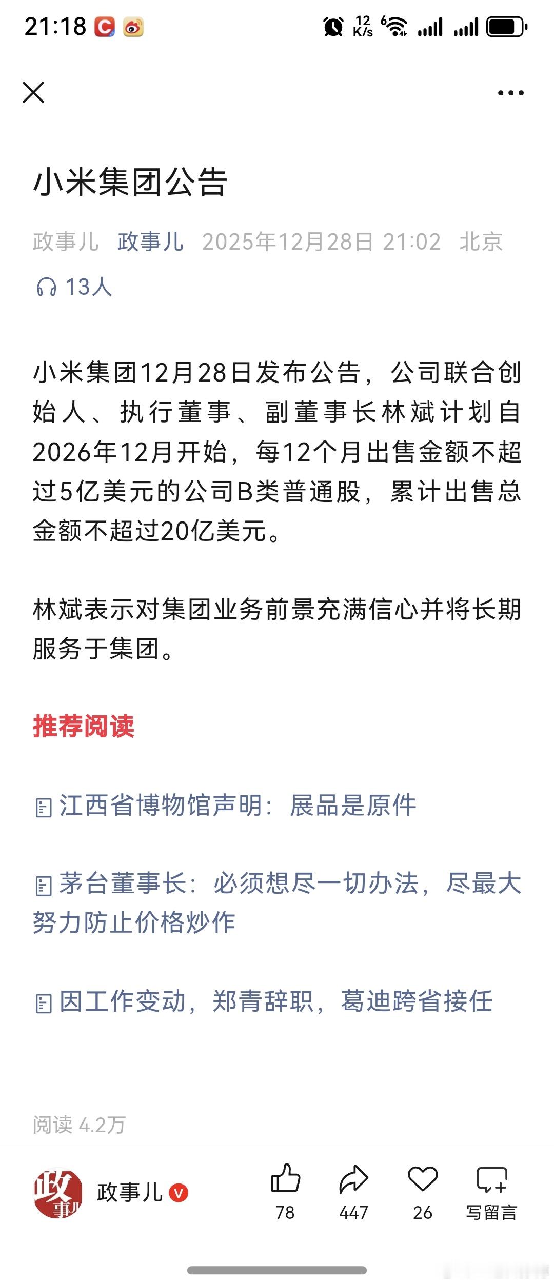 小米集团公告,副董事长林斌要从26年的12月份开始逐步减持了。这个就不多分析,就小范围说道说道了。大v聊车