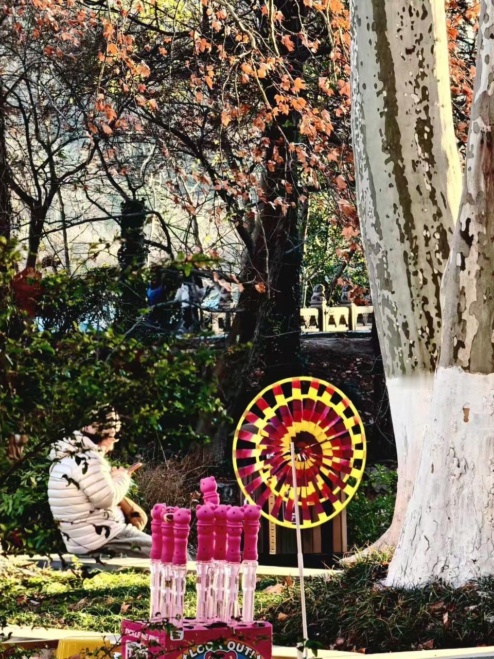 🎡彩色风车把秋阳切成糖纸,粉泡泡棒盛着童年的甜,连风掠过都在帮光阴数快乐碎片。 🍂树影筛着暖金的光,风车转成童年的漩涡,那些粉粉的梦,正和落叶一起躺在秋的掌心里。 ✨老树枝桠挂着秋的余温,风车把时光旋成彩虹色,粉嘟嘟的泡泡棒旁,藏着整个季节的温柔童话。