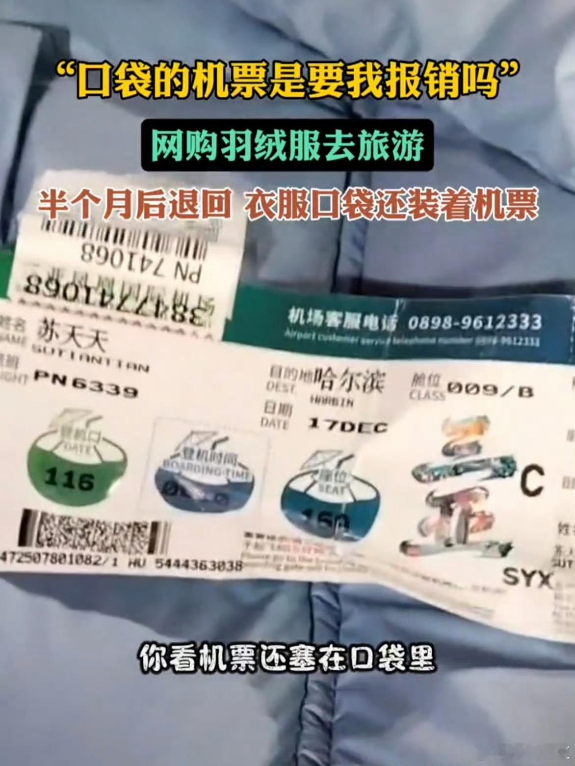 网购羽绒服半个月退回口袋装着机票 这位海南的苏女士,现在全国人民都知道你了,你在海南买个羽绒服穿去哈尔滨旅游,衣服穿过沾上油渍了,怎么还好意思退回去,目前商家只能起诉她索赔,对于这种没有诚信的消费者,可以列入网购黑名单。