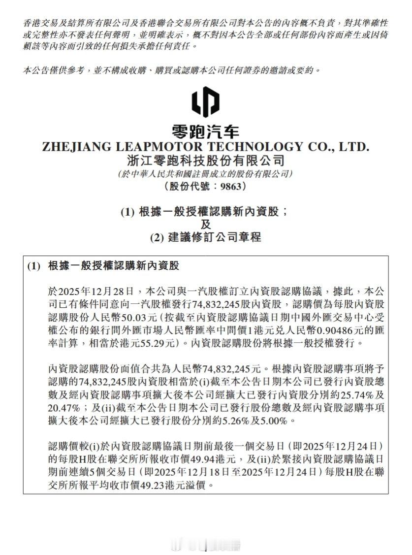 【一汽股权认购零跑近7500万股零跑拟向一汽股权发行内资股】零跑汽车在港交所公告,12月28日,公司与一汽股权订立内资股认购协议,据此,公司已有条件同意向一汽股权发行74,832,245股内资股,认购价为每股内资股认购股份人民币50.03元(相当于55.29元港元,零跑最新收盘价为49.84港元)。内资股认购股份将根据一般授权发行。(同花顺)一汽股权溢价认购零跑近7500万股