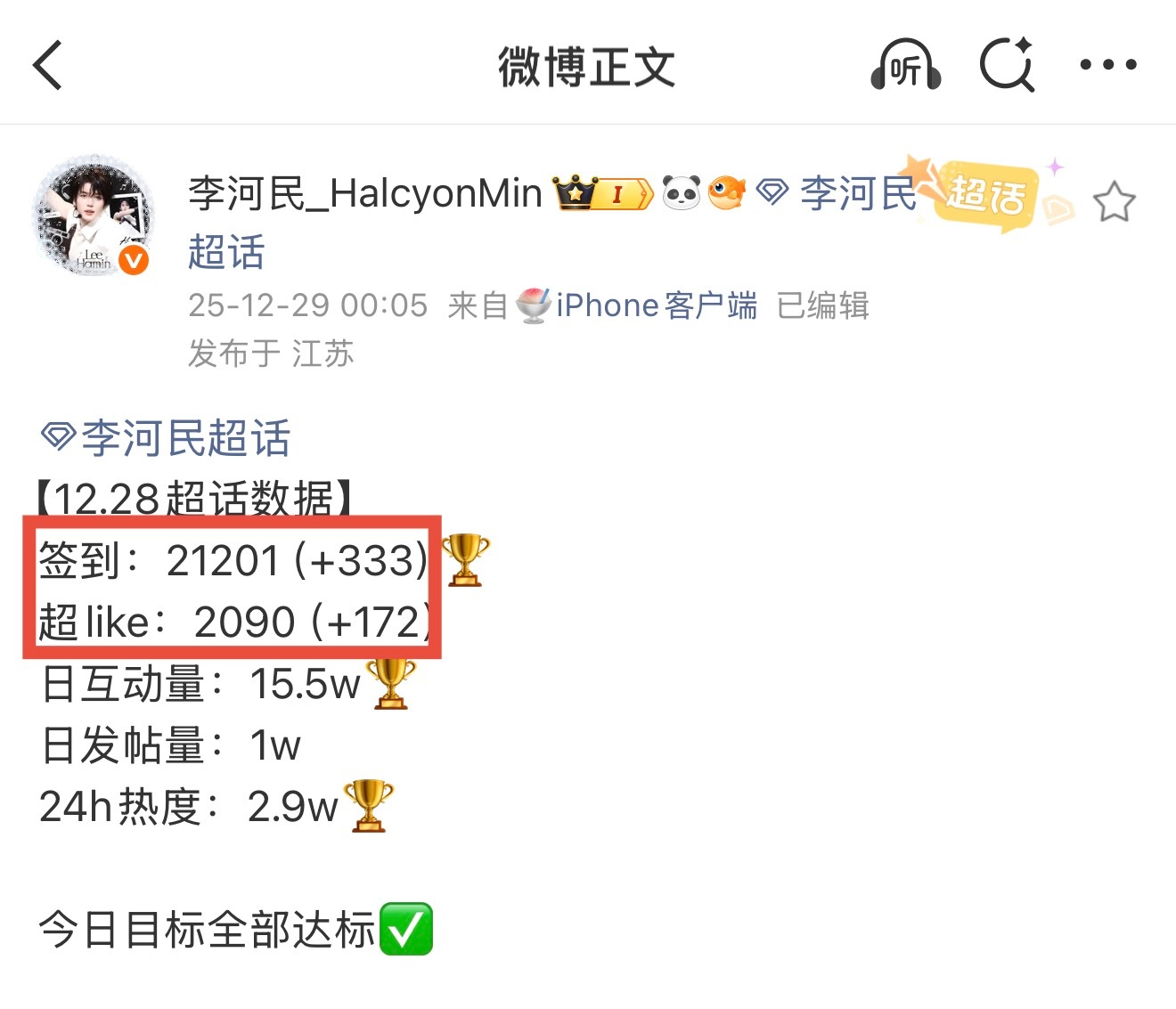 卷丝们在往好的趋势前进,看到大家拧成一股绳齐心协力做数据真的特别给力。昨天各项数据值直线上升,超like人头数重新突破2k,签到在稳居第一的基础上破2.1w人,发帖量也逐渐增加…说明我们确实有能力把事情做好,虽然增幅不算特别大,但目标不可能一蹴而就,只要新的一天相较前一天有直观小涨幅,这就算一次质的突破,按照这个势头,我们总会重回第一的位置。在过程中也出现了一些问题❓1️⃣还是有人仍未能重视/满足多浩的积累,检查一遍,确认人手浩数量是否达到五个或以上?做数据最讲求人手有没有足够的浩以此推动人头数的翻倍式增长,要及时养浩、保证活跃性不是si浩,才能实现效率最大化。2️⃣仍缺乏对任务时效性的重视,习惯将今天任务拖延至次日完成,当天数据仅在24小时内有效,是每日统计拉表的依据,逾期数据将计入下一天,这会间接导致当日数据记录极其不稳定,没有展现真正人数。3️⃣发帖、互动度不积极,参与人数不达标,加分慢,导致超like涨幅慢。请大家务必积极参与,去同担的帖子下留言评论、自己发布几条碎碎念的原创动态到超话,也能有效积累个人超like积分。已经是超like的,每天只需加几分就能维持,不是的只要按照流程来积累,三天内就能成为,真的很简单易上手。提出问题及时改进问题,对于数据不能急于求成,慢慢来放平心态保持定力,一步一个脚印踏实落地。写这些我也想告诉大家,打破周末日才能“做好”数据的刻板思想,不管工作日还是周末日我们每一天都能做好,保持住,这不是虚假繁荣的人头数,是一天要争取比一天做得好。