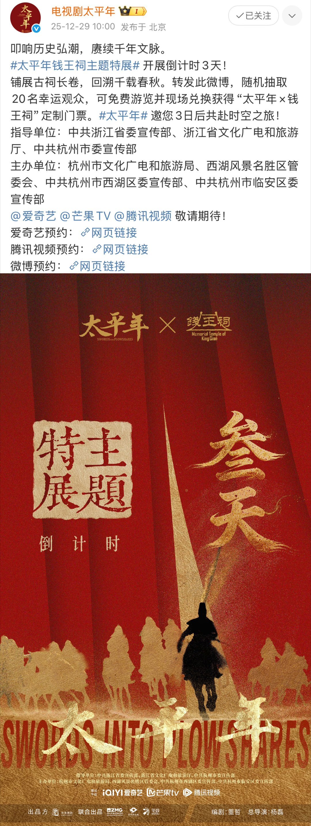 太平年钱王祠主题特展硬核指导单位坐镇,纪实大剧《太平年》开播前就搞线下展,钱王祠和剧情适配度满分,白宇演的钱弘俶更是让人一秒入戏,跪求火速定档!