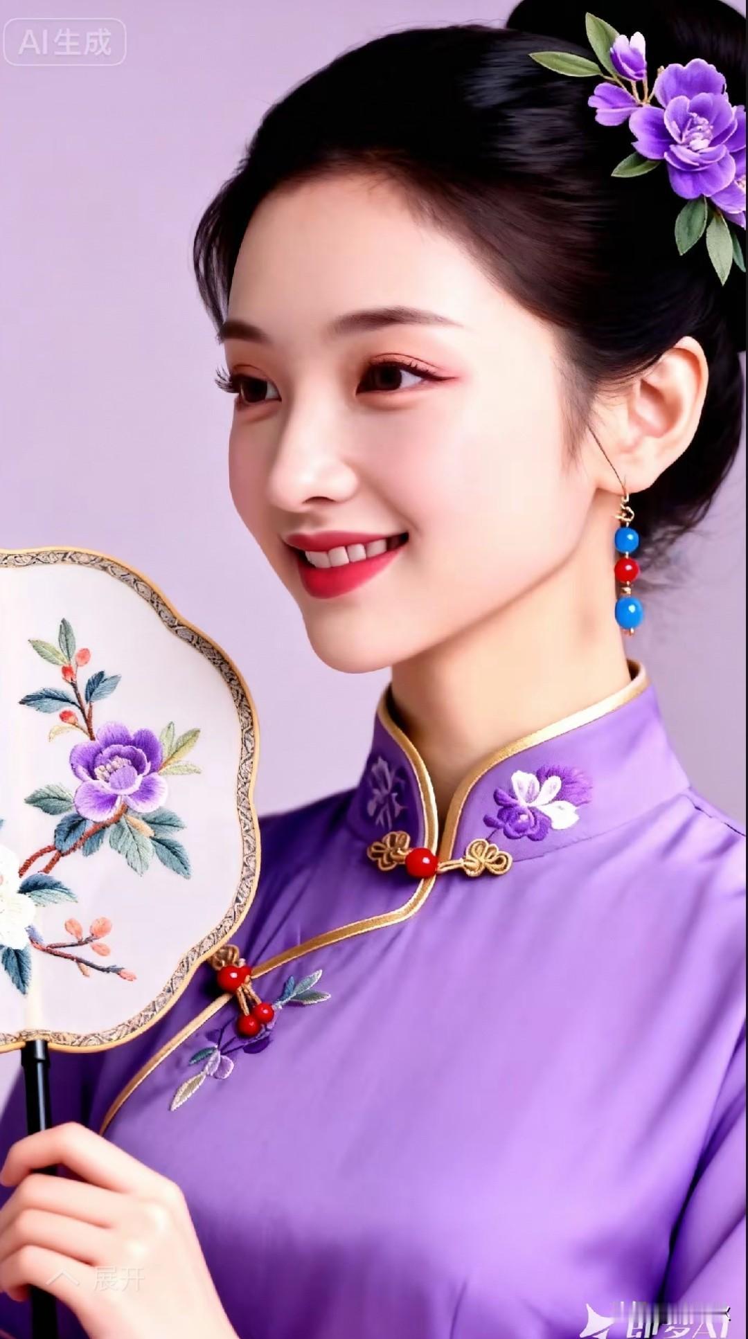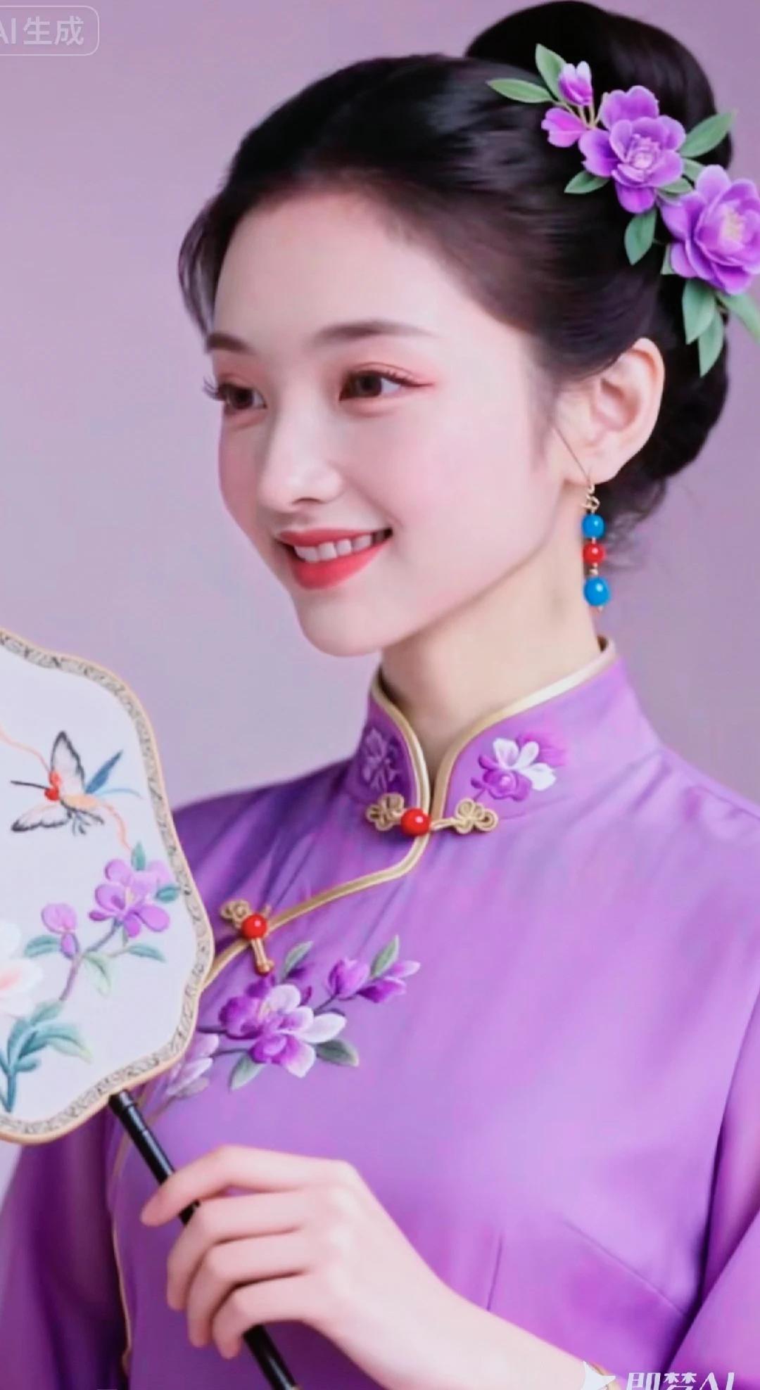 眉似春山寒远黛, 目若秋水映繁星。 紫色旗衫,温柔江南 明眸皓齿,面若冠玉 花容月貌,千姿百态 出水芙蓉,仪态万方
