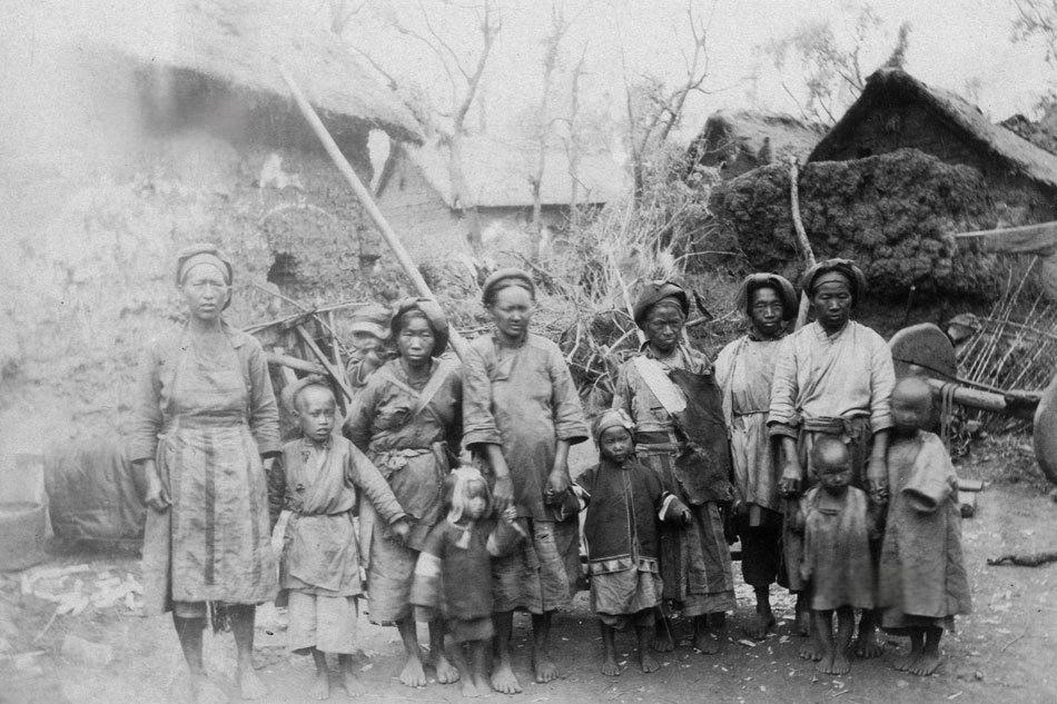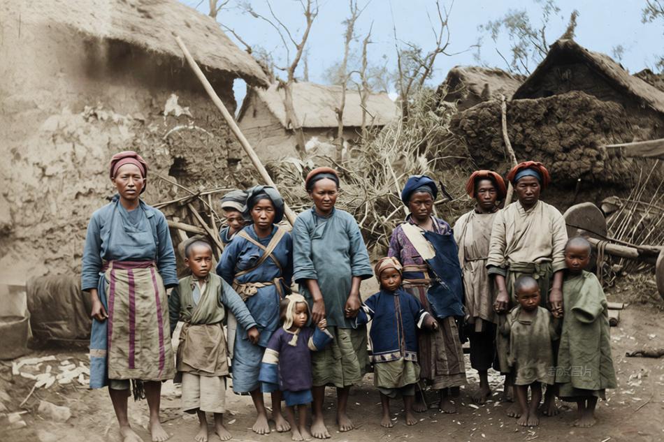 这张老照片拍摄于20世纪上半叶,重庆地区(旧巴渝或川东乡村)的一个普通农家家庭合影。 照片中约12-15人,多为妇女和儿童,少见成年男子,可能外出劳作,大家站在简陋的土墙茅草屋前合影。儿童衣着类似,多光脚或草鞋,表情拘谨却自然。身后是重庆乡村民居:泥土墙、茅草顶、竹木结构,地面泥土散落杂物,周边稀疏树木。