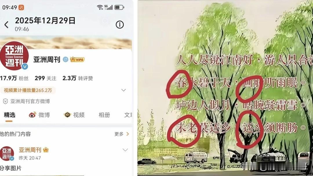 以前说到“藏头诗”都是在小说电影里,实在没想到有一天也会发生在我们身边。亚洲周刊刚因为某些原因把前面硬刚南博的帖子删了,转手就发了一首诗。有细心的网友发现,诗句3、4、7、8句的第一个字连起来竟然是“春画未还”,这不就是妥妥在说《江南春》这幅画被鉴定为赝品出售的事嘛!不得不服文化人打哑谜真有一手,你以为是别人在感慨人生,没想到人家是感慨一幅画的命运。