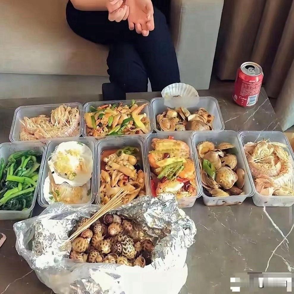 秦海璐这顿饭估计顶我10天工资了吧。 有贝类、虾类、海鲜类、时蔬、肉类,涵盖清蒸、爆炒、卤制、香煎等多种做法,还有可乐。 从食材的选用,到菜肴的搭配和烹制上,都能看出对这顿饭的用心,可以说是非常有特色。 丰富的荤素搭配,也恰到好处地呈现出北方人朴实无华的烹饪取向。 品类之全,规格之高,可以看出秦海璐平时在饮食上没有太多的节制,反而更注重搭配和自己的喜好。