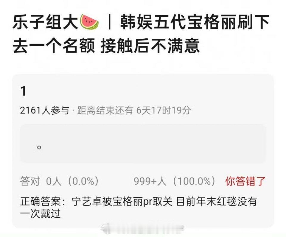 🍉传宁艺卓被宝格丽退货了,10月还带着宝格丽珠宝出席vigue红毯,12月红毯就没有戴宝格丽了,这样宝格丽还有机会新增一个内娱艺人sw,谁能拿下呢?
