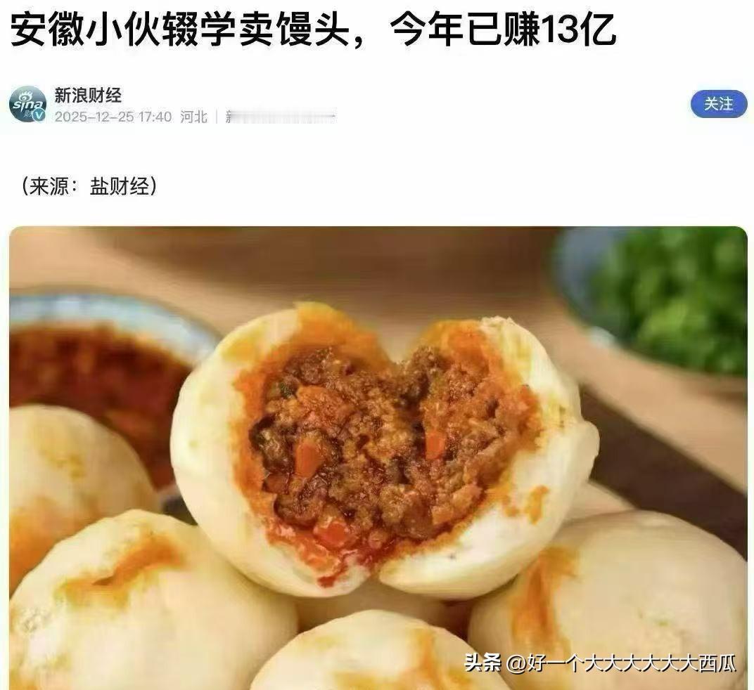 安徽小伙辍学卖馒头, 今年已经赚了13亿元! 没有看新闻内容, 但是毫无疑问这种属于标题党行列, 假设是真的卖馒头, 一个馒头的利润有多少, 然后要卖到13亿元的馒头又要卖出去多少。 希望以后这些新闻媒体不要制造这样的标题党新闻, 真的让人看了又好气又好笑。