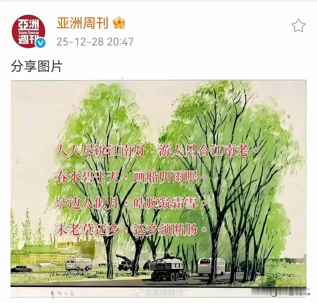亚洲周刊也是尽力了, 之所以发出这首打油诗,可能也是无奈的表现, 所谓明枪易挡,毕竟在面对看不见的无形网的时候,在面对大局的时候,任何人的主观想法是很渺小的。 不过周刊的同志们也算是突破了历史,能够把冰山给掀开一角,确实耗尽了所有的力气,所谓还乡须断肠,值得点赞!