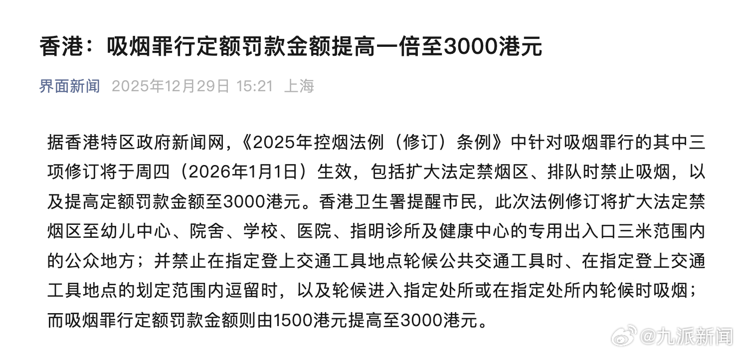 【#香港吸烟罪行罚款提高至3000港元#】12月29日,据界面新闻援引香港特区政府新闻网:《2025年控烟法例(修订)条例》中针对吸烟罪行的其中三项修订将于周四(2026年1月1日)生效,包括扩大法定禁烟区、排队时禁止吸烟,以及提高定额罚款金额至3000港元。香港卫生署提醒市民,此次法例修订将扩大法定禁烟区至幼儿中心、院舍、学校、医院、指明诊所及健康中心的专用出入口三米范围内的公众地方;并禁止在指定登上交通工具地点轮候公共交通工具时、在指定登上交通工具地点的划定范围内逗留时,以及轮候进入指定处所或在指定处所内轮候时吸烟;而吸烟罪行定额罚款金额则由1500港元提高至3000港元。