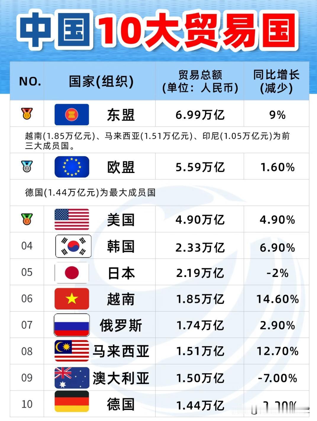 2025 中国 top10 贸易国盘点! 宝子们,2025 中国十大贸易国的清单出来啦,一起看看今年的贸易格局~ 🔝榜首:东盟贸易总额达到 6.99 万亿人民币,同比增长 9%。(东盟内部前三的贸易伙伴是:越南 1.85 万亿、马来西亚 1.51 万亿、印尼 1.05 万亿) 🥈第二名:欧盟贸易额 5.59 万亿,同比小幅增长 1.6%,其中德国是欧盟里和咱们贸易额最高的(1.44 万亿) 🥉第三名:美国贸易额 4.9 万亿,同比增速 4.9% 后面几位里也有不少看点: 越南排在第 6 位,贸易额 1.85 万亿,同比增长 14.6%,增长势头比较明显 马来西亚(第 8)同比增长 12.7%,同样保持了不错的增长 日本、澳大利亚、德国这几个的贸易额则是同比略有下降,其中澳大利亚降幅为 7% 整体的贸易往来分布还挺有观察性的~