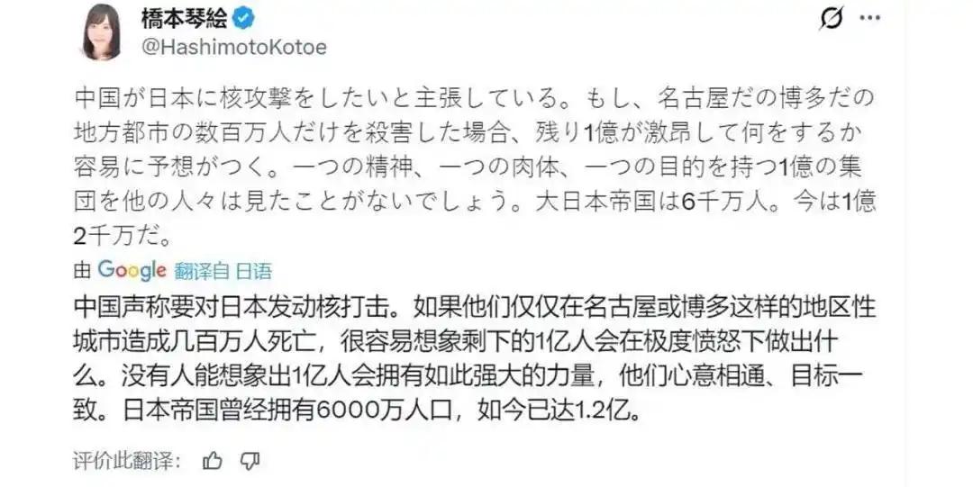 日本右翼圈子里的“话题人物”桥本琴绘又抛出了惊人的说法:若中国核弹造成日本几百万人死亡,那剩下的1亿日本人将开始反击。 这番充斥着核恐吓意味的极端表述,看似是情绪化的叫嚣,实则是日本右翼势力借虚构威胁煽动民意、推进政治议程的刻意操作。 桥本琴绘这位出身广岛县尾道市的右翼人士,毕业于九州大学后曾赴英国进修,却始终秉持极端保守立场,不仅是日本首相高市早苗的铁杆支持者,更著有《新大东亚战争肯定论》等美化侵略历史的书籍,核心思想便是为二战日本角色翻案、鼓吹军国主义与核威慑必要性。她的言论从不是孤立的个人宣泄,而是与日本右翼的政治诉求深度绑定的发声。 桥本琴绘的此番言论,字里行间充斥着对核战争的无知与对生命的漠视。她轻描淡写地将“数百万人死亡”视为可承受的代价,却刻意回避了核打击的真实毁灭性。 以她提及的名古屋为例,这座都市圈人口超千万,若遭遇核打击,直接死亡人数可能达600万至1500万,后续的辐射污染还将造成千万级的长期损伤,绝非“区区几百万”就能概括的数字。 这种将生命工具化的表述,正是日本右翼话术的典型特征:先捏造威胁,再妖魔化对手,最终煽动民族仇恨。 更荒谬的是,她言论的前提本身就是无稽之谈。中国自1964年首次核试验成功以来,始终坚定奉行“不首先使用核武器”“不对无核国家和地区使用核武器”的原则,这是国际社会有目共睹的坚定承诺。 所谓“中国将对日本实施核打击”的说法,完全是桥本琴绘为煽动情绪而凭空捏造的谎言。她刻意无视这一基本事实,本质上是为了构建“中国威胁论”的叙事,为日本右翼的扩军修宪图谋寻找借口。 这番极端言论的出炉,恰逢日本政治右倾化加剧的关键节点。高市早苗内阁上台后,不仅推动防务预算提升至GDP的2%,还公开讨论修改日本奉行数十年的“无核三原则”,甚至在台湾问题上抛出“存亡危机事态”的危险言论,企图援引“集体自卫权”干涉中国内政。 桥本琴绘的核恐吓言论,正是在为这一系列右翼议程造势——通过渲染“外部核威胁”,让日本民众接受“必须强化军事能力”的逻辑,为修宪打破“专守防卫”、推动自卫队“国军化”铺垫社会基础。 值得警惕的是,这种言论背后还暗藏着日本右翼的拥核野心。国际原子能机构的数据显示,日本目前储存着约47吨分离钚,这些核材料足以制造多枚核弹,再加上其领先的核工业技术与火箭运载能力,从技术层面具备短期内研制核装置的潜力。 桥本琴绘反复炒作核话题,本质上是在试探国际社会对日本拥核的容忍度,为突破“无核三原则”制造舆论氛围。 然而,桥本琴绘的叫嚣终究是脱离现实的政治表演。盖洛普民调显示,仅9%的日本人愿意为国作战,这一比例在全球处于最低水平,超过68%的普通民众明确反对“军扩到战争边缘”,反核武、反军国主义仍是日本社会的主流民意。 她口中“1亿人集体反击”的场景,不过是右翼圈子自欺欺人的幻想,多数日本民众早已看透这种将国家拖入危险境地的政治操弄。 从国际层面看,桥本琴绘的言论也遭到广泛质疑与警惕。中国外交部明确批评此类言论加剧地区紧张,强调中国的核政策具有高度稳定性与防御性。 美国虽为日本盟友,也未支持其拥核动向,反而敦促日方保持克制;韩国、朝鲜等曾遭受日本侵略的地区国家,更是对日本右翼的军国主义倾向保持高度警惕。 国际危机组织在报告中明确警告,东亚最大的核风险并非核武器本身,而是政治势力刻意制造的核恐慌。 说到底,桥本琴绘的极端言论,是日本右翼势力在政治右倾化进程中上演的一场危险闹剧。她将数百万生命视为筹码,将核战争当作政治工具,本质上是在为军国主义复辟铺路。 这种无视历史教训、践踏人类良知的行为,不仅会加剧东亚地区的紧张局势,更会将日本民众推向战争的深渊。 历史早已证明,军国主义的幽灵一旦复活,必将带来毁灭性的灾难。当前的东亚和平局面来之不易,需要地区内所有国家共同守护。 国际社会必须对日本右翼的危险动向保持高度警惕,坚决遏制任何破坏核不扩散体系、试图复活军国主义的行径。 而日本也应当正视历史、尊重民意,放弃以邻为壑的危险图谋,唯有与邻国和睦相处,才能真正实现国家的长治久安。
