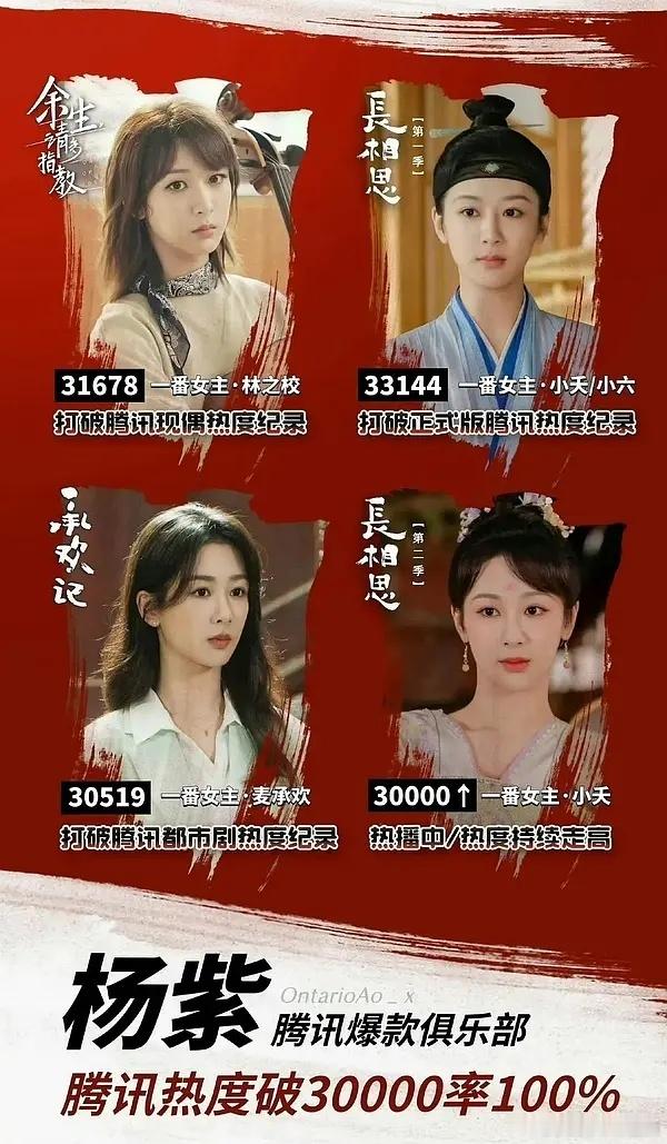 杨紫有8部破万剧,内娱第一鹅四部破三万,余生请多指教、承欢记、长相思1、长相思2优酷两部破万,沉香如屑、要久久爱咪咕两部破万,国色芳华、锦绣芳华抖话题也是8部破百亿第一还有3个视后提名,杨紫小夭、杨紫何惟芳、白玉兰视后提名,杨紫麦承欢总台视后提名过往辉煌,前途灿烂,就是这个杨紫