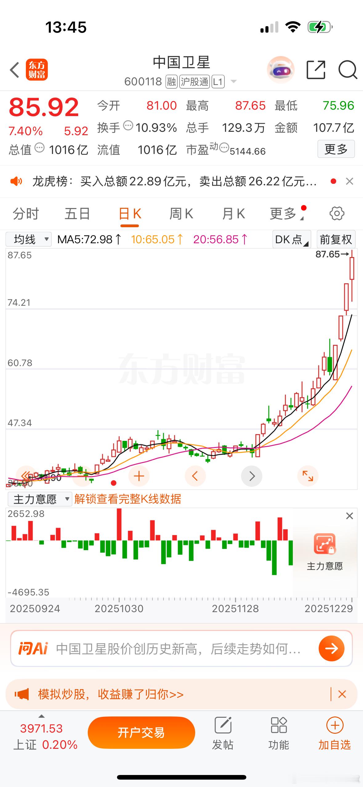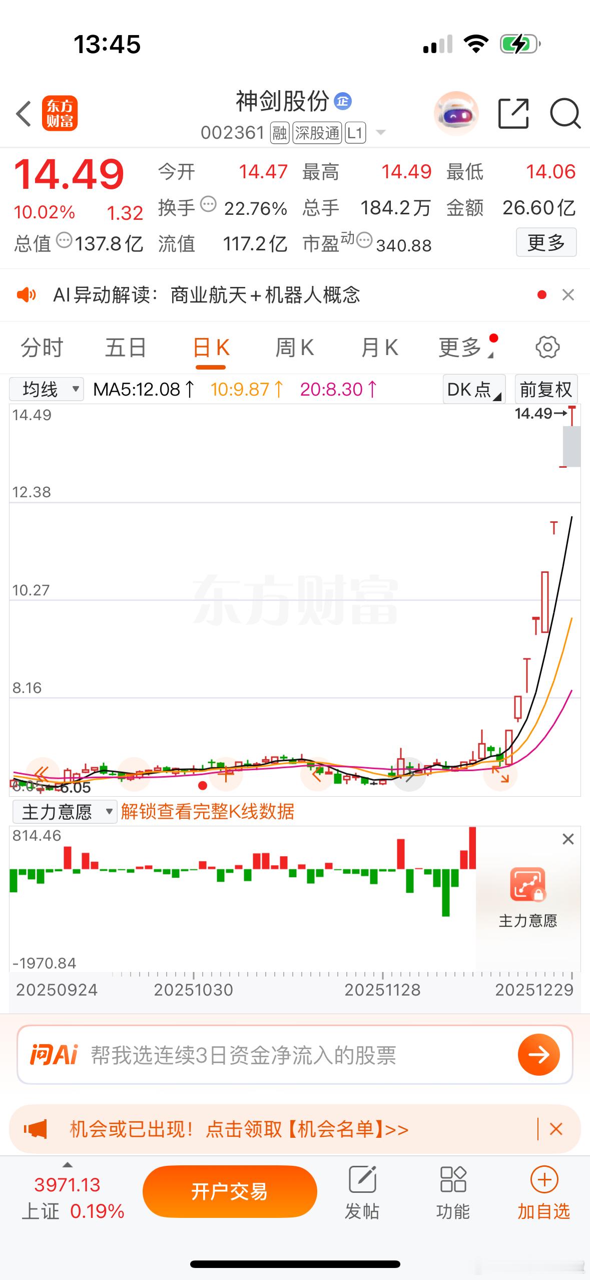 商业航天表现继续超预期,资金整体是去弱留强,开始抱团。总龙头航天发展连板,大中军中国卫星接近4连板,弹性龙头超捷股份挑战异动接近4天3板,连板龙头神剑股份8连板挑战异动,参股蓝箭龙头金风科技3天2板。实际上还是围绕着周末发酵的三大热点在做,一是商业航天的分歧淘汰赛抱团,二是有色资源股的趋势性抱团,三是跨年妖股争夺赛的抱团。