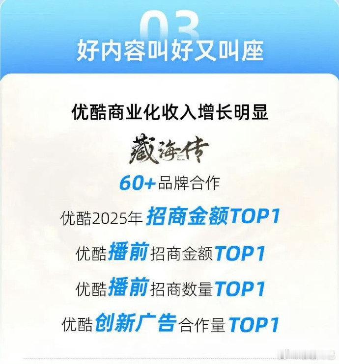 藏海传2025至今优酷招商金额第一藏海传招商第一是优酷反复认证过的,不是粉丝和营销号喊出来的,你看优酷又开始给它的剧王买热搜力证第一了,第一有说服力够权威才有利于平台后续招商。