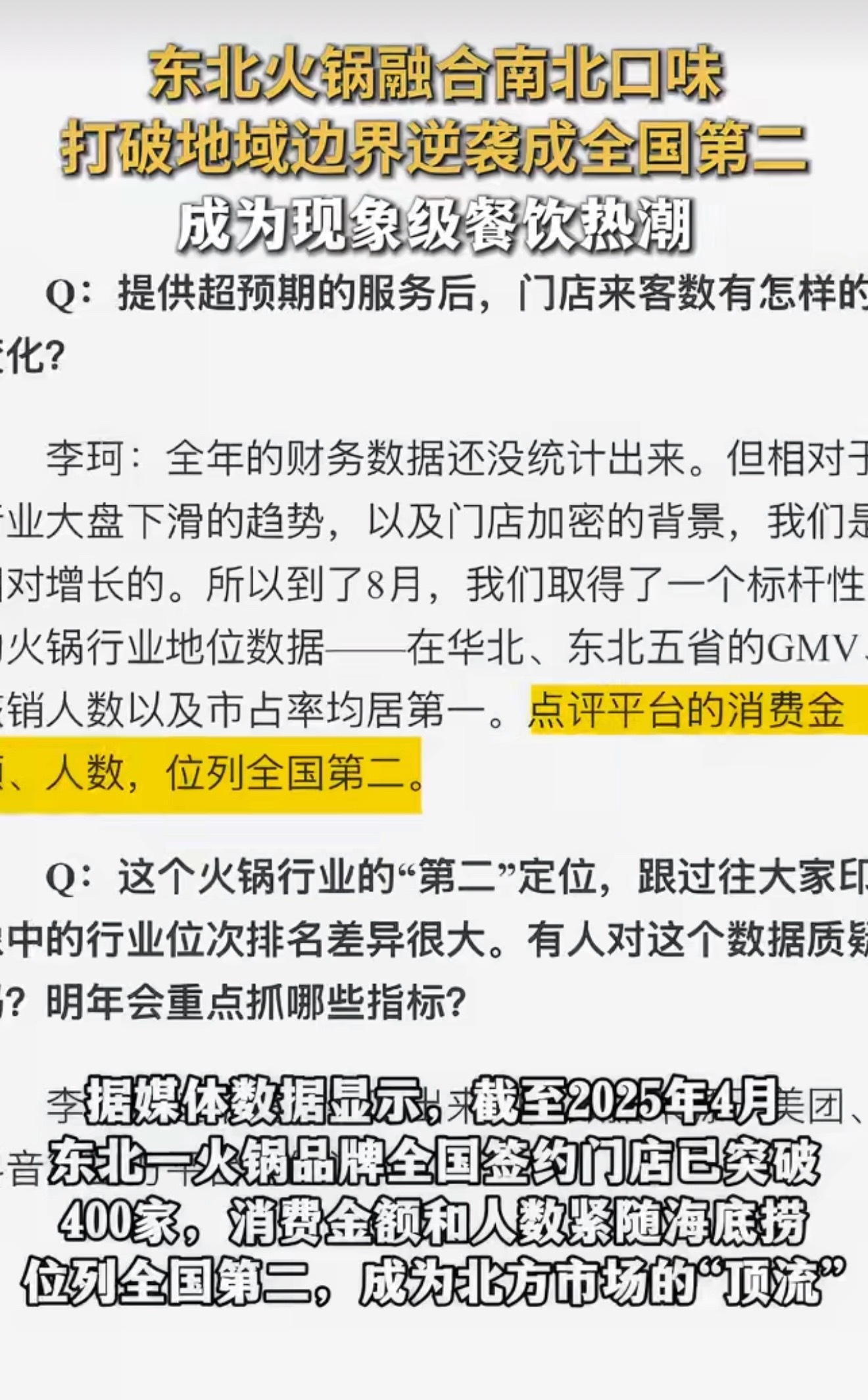 东北火锅逆袭成全国第二南北差异被东北火锅狠狠拿捏【火锅市场大洗牌!东北火锅凭什么逆袭成“顶流”?】当整个火锅行业告别野蛮生长,陷入均价下跌、翻台率承压的“寒冬”时,有一匹黑马却跑出了逆势上扬的曲线——东北火锅。数据显示,一个东北火锅品牌的消费规模已冲至全国第二,成为现象级“顶流”。它的破局秘诀在于,果断跳出了“正宗陷阱”:不再执着于原教旨主义,而是灵活依循南北方口味差异,改良锅底、调整食材,用更普适的亲和力打破了地域餐饮的边界。这背后是消费理性化的趋势。当食客们不再只为“名气”买单,性价比、体验感和口味适配度就成了真正的胜负手。东北火锅的这轮逆袭,或许正为整个餐饮市场提供了一个“寒冬”中如何生存与增长的范本。
