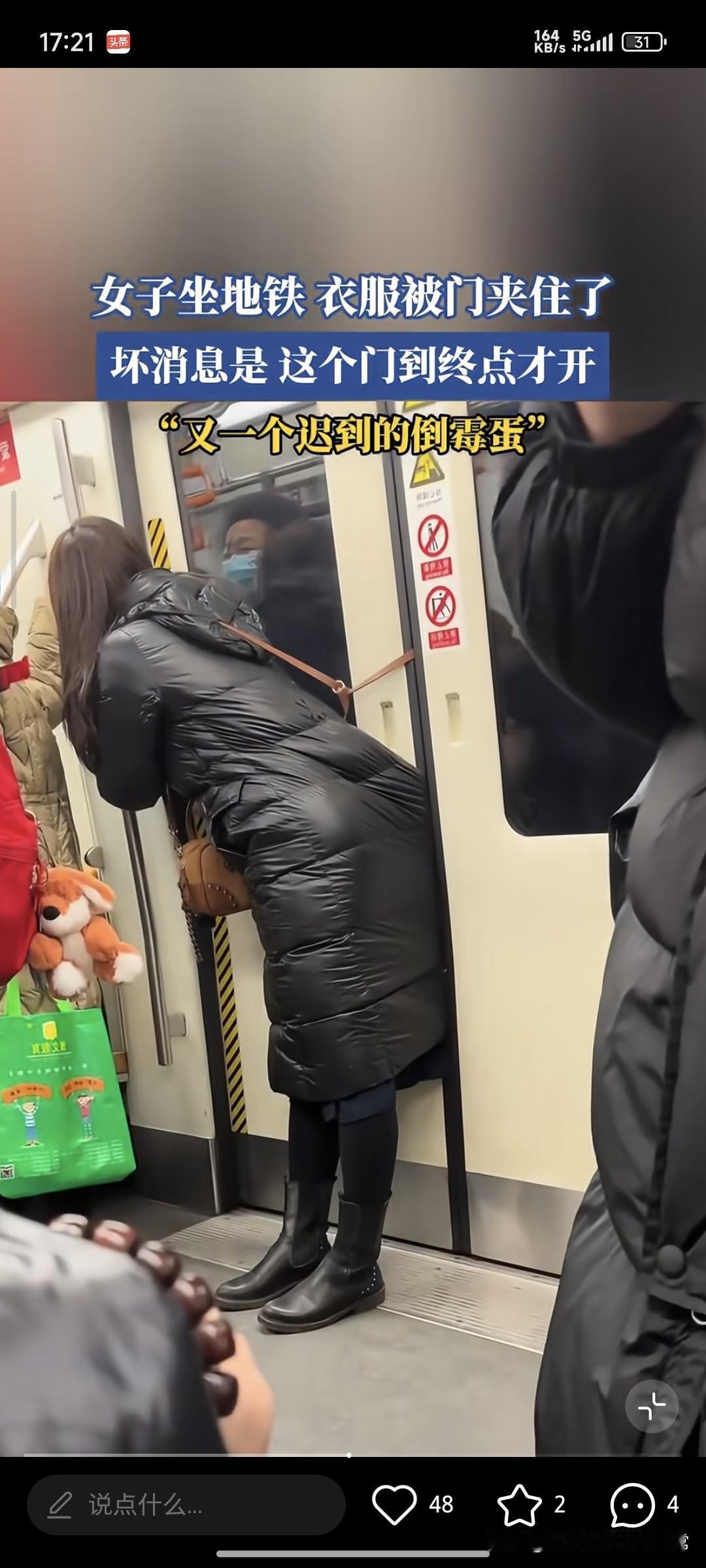 女子坐地铁门夹衣还得坐到终点! 辽宁地铁里这幕也太扎心了!12月29日,一位女子的羽绒服被地铁门死死夹住,更绝望的是,这扇门要到终点站才会开,她只能保持着弯腰被拽的姿势一路僵着,隔着屏幕都替她难受😣 想想打工人通勤的日常,赶地铁跟打仗似的,生怕晚一秒就迟到扣钱。这下倒好,不仅得顶着怪异姿势被全车人围观,迟到更是板上钉钉,换谁不得心态崩了? 不过也有人说,地铁关门时都会有警示音和灯光,自己不注意也得担点责任。但咱通勤族都懂,早晚高峰地铁挤得像沙丁鱼罐头,有时候真不是故意不注意,是身不由己啊。 那大家觉得,这事到底是女子自身疏忽,还是地铁设施该更人性化些?