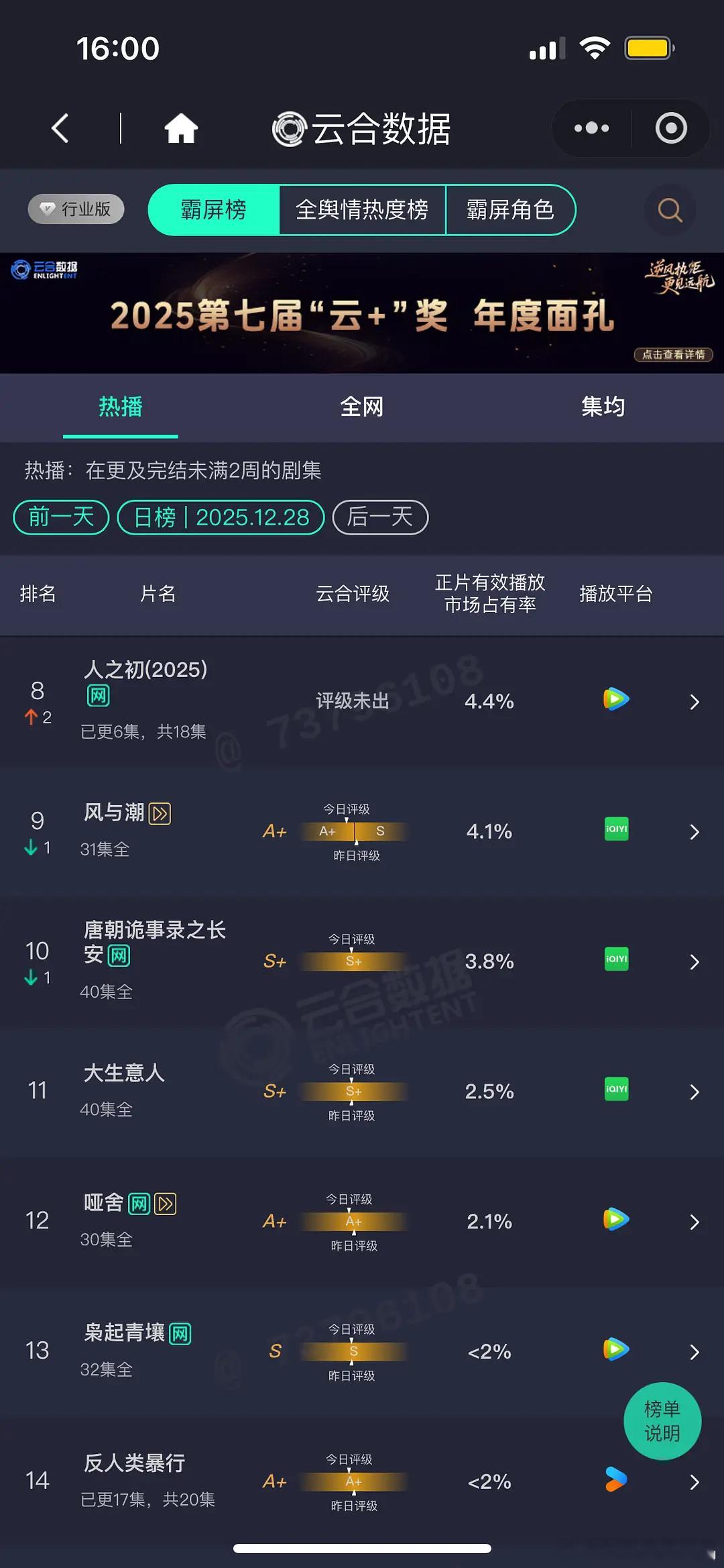 12.28 云合 老舅17.5% 罚罪13.6% 骄阳13% 逍遥11.8% 人之初4.4%