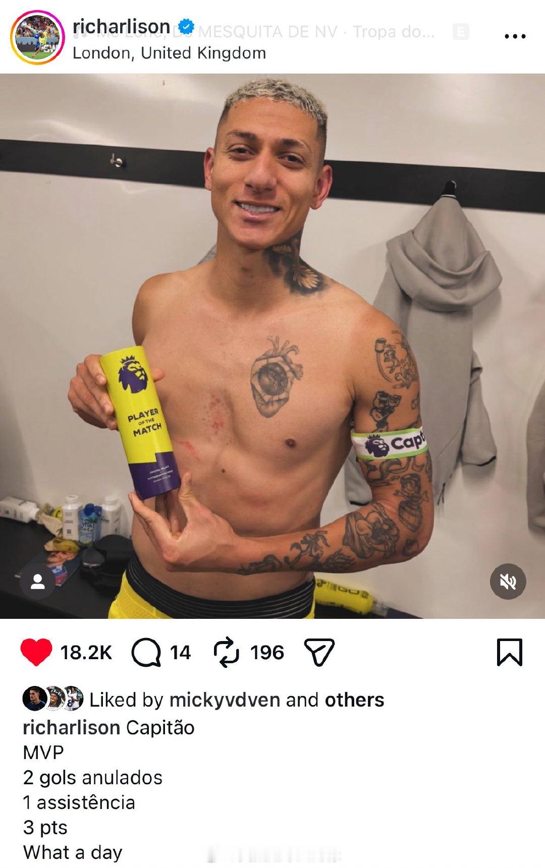 【进球看心情】平心而论,理查利森本赛季的状态是不错,18场联赛,一共出场1075分钟,7球3助攻。相对于特尔、穆阿尼、索兰克等热刺前锋,“倒钩高手”是比较靠谱和稳定的得分点。理查利森主要的问题有两个,一是情绪没有控制好,进球还没有确定就疯狂庆祝,本赛季他已经多次进球后被吹掉,这肯定会影响球员的情绪。二是主动申请黄牌,目前他已经累计拿到4张黄牌,再拿一张就要自动停赛。后话:内马尔玻璃,热苏斯刚刚大伤初愈,若奥-佩德罗不稳定,库尼亚更适合影锋,2026世界杯,巴西队的首发中锋,还要看理查利森。另外,森林的伊戈尔-热苏斯值得“安胖”给他一个名额。