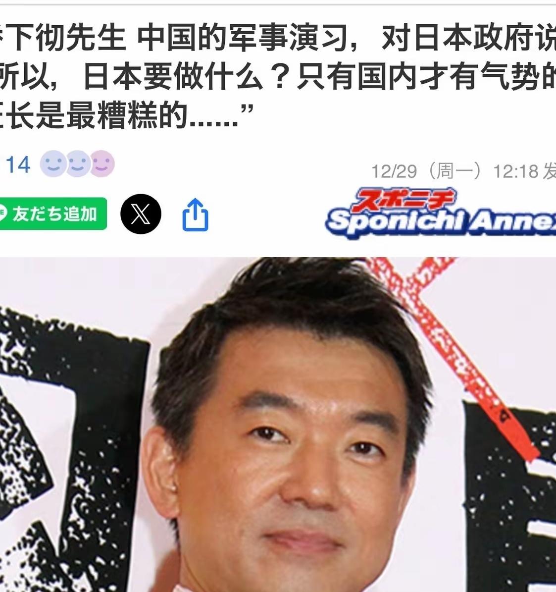 就在刚刚 桥下彻:批评日本当局只会国内强硬发言,建议日本政客少空谈。 今天(29日),日本前大阪府知事桥下彻在社交媒体上对东方大国东部战区启动的“正义使命——2025”军事演习发声,桥下彻称,东方大国将赖清德政权视为“势力代表”。 日本首相高市早苗在国会表示,赖清德政权已明确表示与东方大国对抗,赖清德政权存亡与否,将影响日本是否有余力应对东方大国。高市称,相关局势可能构成存亡危机,赖清德政权存亡,将使日本面临更大压力。 对此,桥下彻表示,批评日本当局只会在国内强硬发言,做空头,表示强硬立场,但缺乏实际行动,强硬发言只会让民众感到安心。 彻底无能之相! Why do you say that only strong words in the country will do? Please take care of your own affairs.