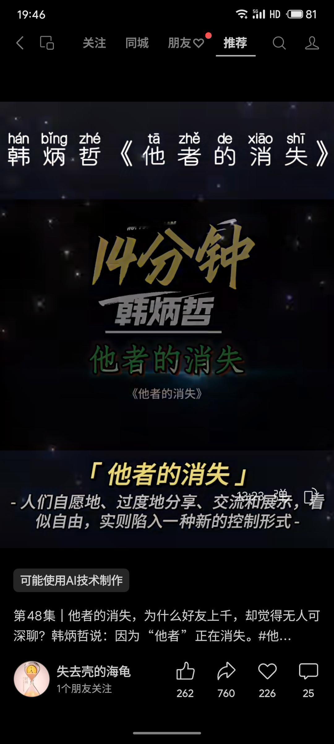 韩炳哲在《他者的消失》中指出,当代人虽热衷于分享与连接,却陷入同质化的交流中,真正的“他者”与差异性逐渐消失。这导致即便社交频繁,仍感无人深谈,自由表象下实为一种新的控制形式。