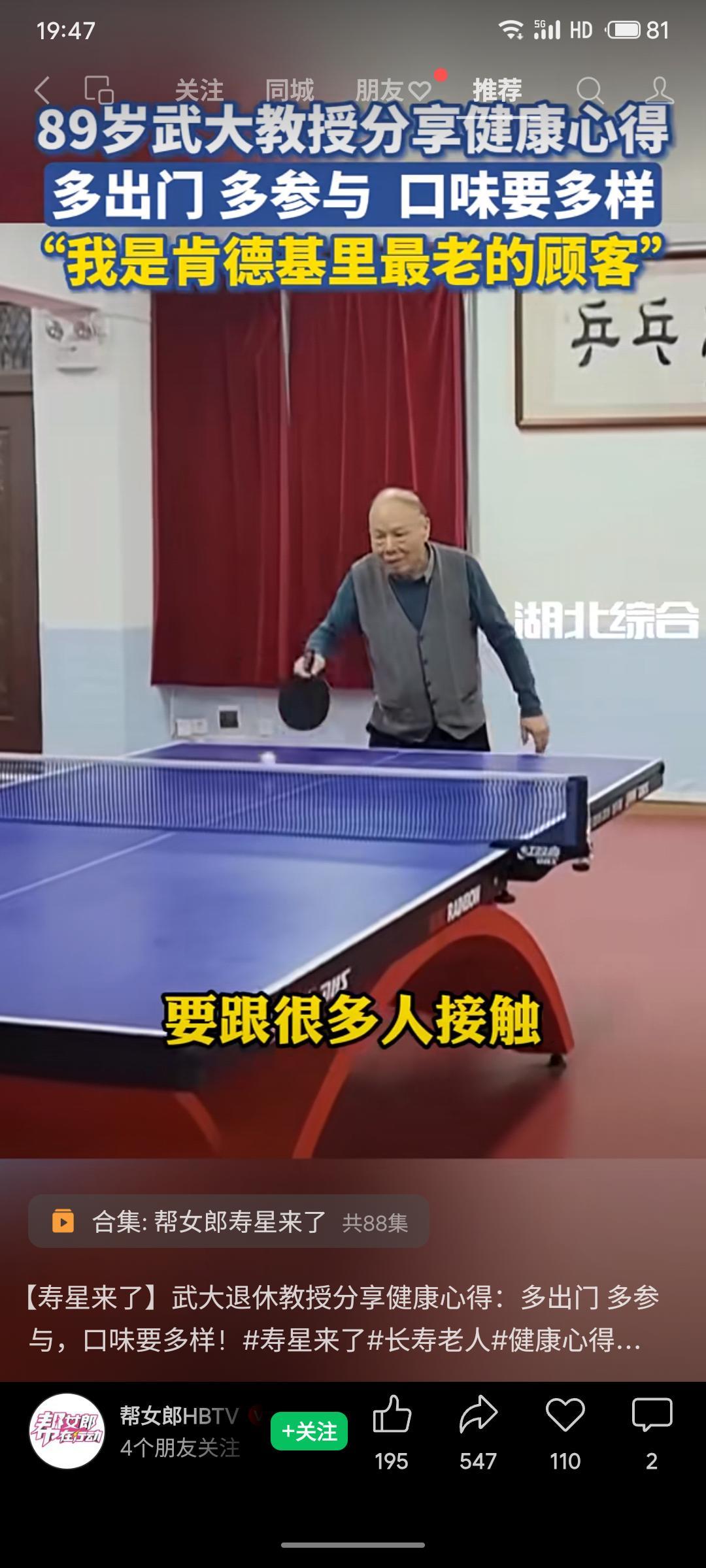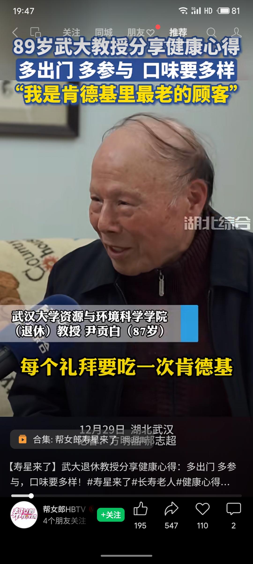 89岁的武大退休教授尹贡自分享其健康心得:主张多出门社交、保持参与感,并强调饮食口味需多样化。他笑称自己是“肯德基里最老的顾客”,每周都会吃一次,以此为例说明生活不必过分拘泥传统养生,保持开放心态与多样体验亦是长寿之道。