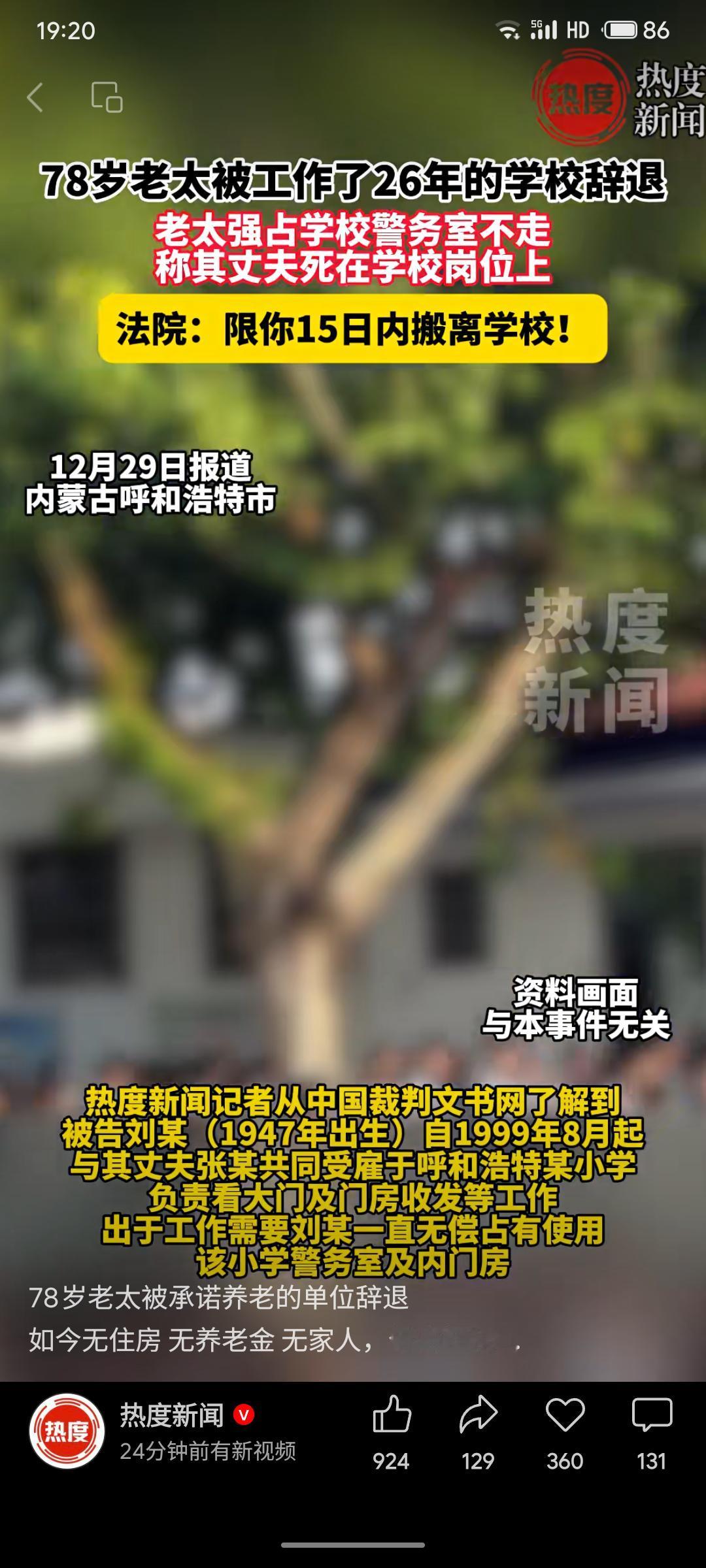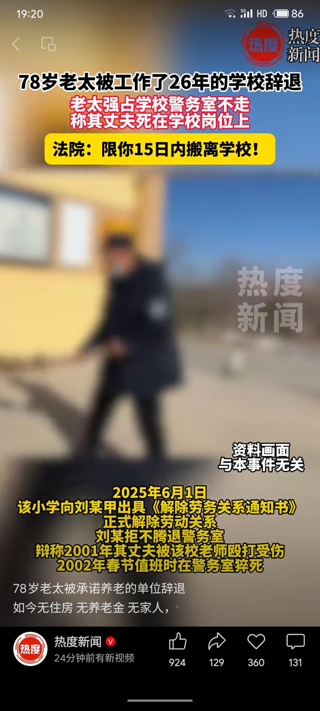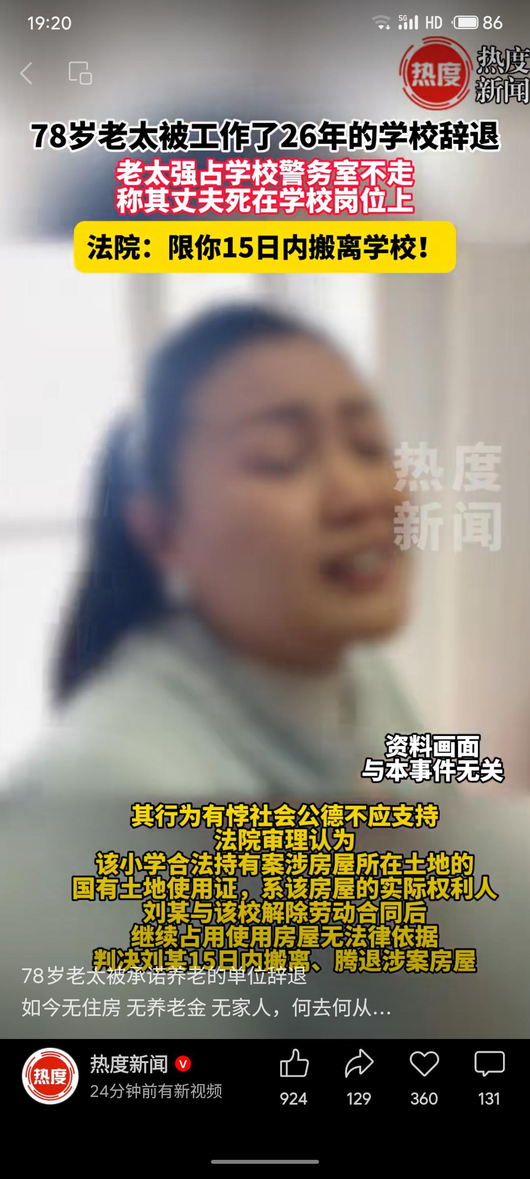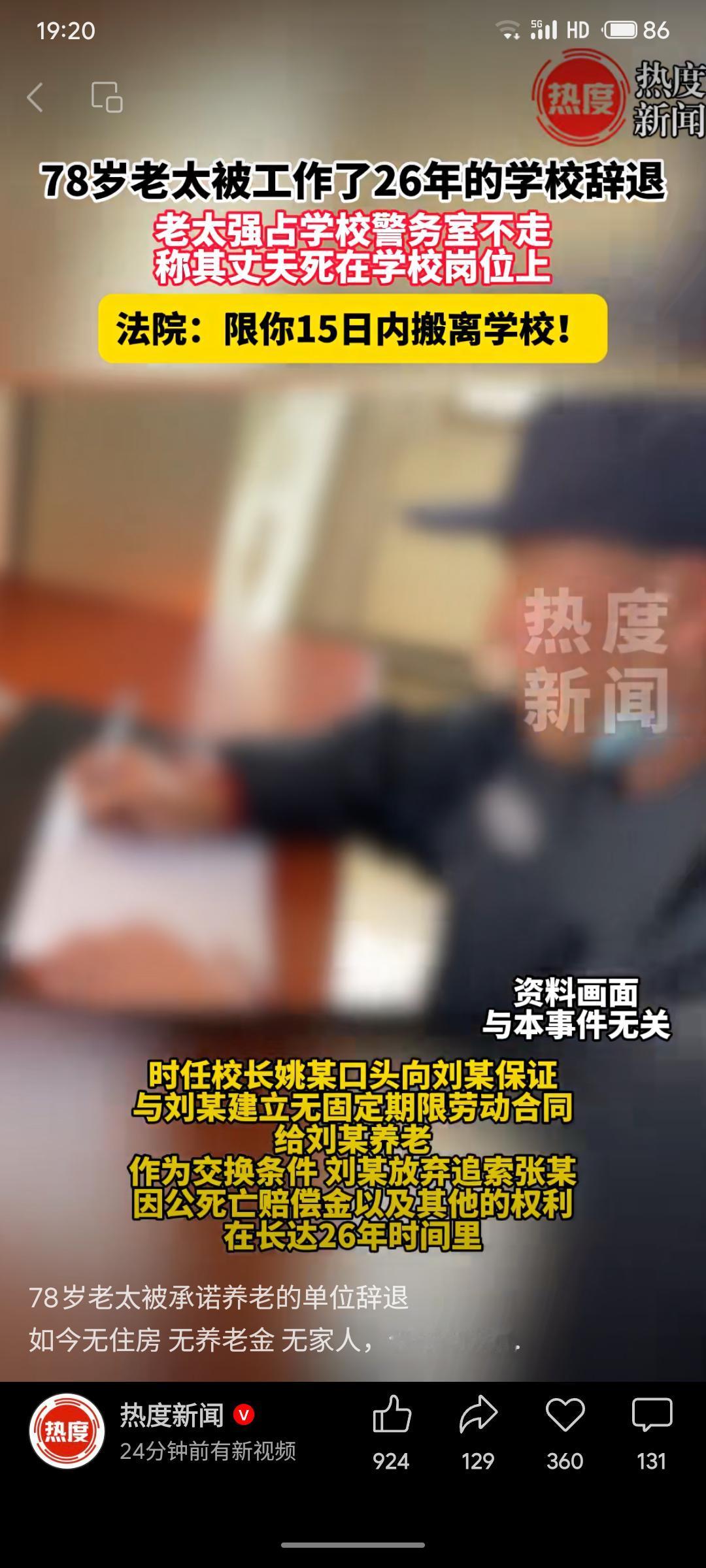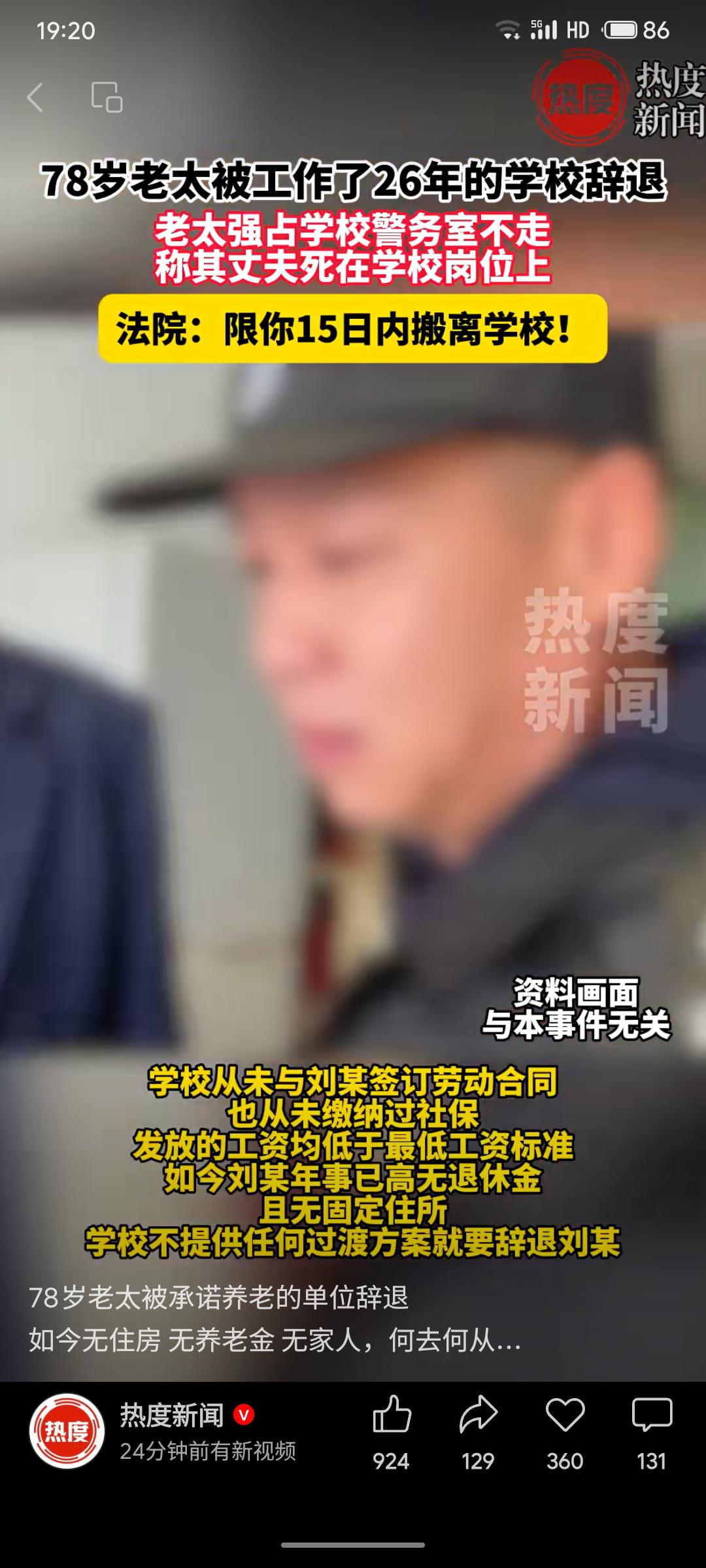 内蒙古呼和浩特市78岁老太刘某,自1999年起与丈夫在某小学工作26年。丈夫在校猝死后,时任校长口头承诺养老,她因此放弃追索赔偿金。学校从未签订劳动合同、未缴社保且工资低于标准。如今刘某被辞退,无住房、无养老金、无家人,强占学校警务室。法院判决其15日内搬离。