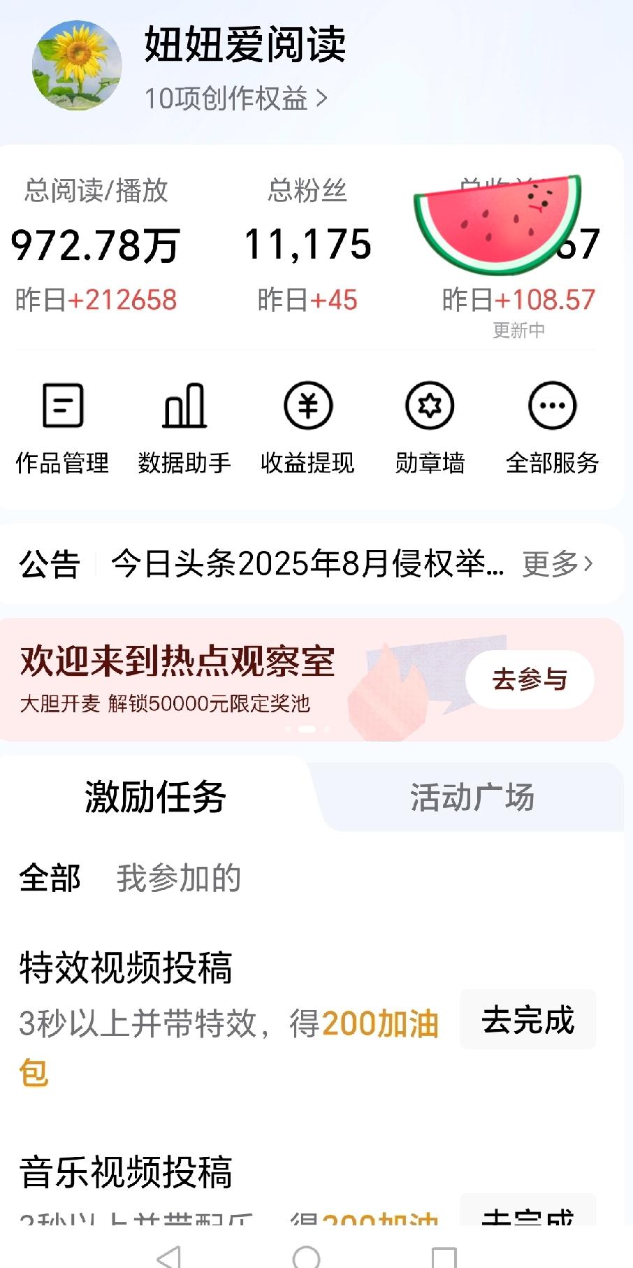 今天收益出来了,千次单价0.51元,21万的阅读收益108元。 今天比昨天少了不到2000个阅读,收益也少了30多元。 昨天千次单价还0.66元,今天就到了0.51元,我也不知道怎么回事,今天的大多数收益还是前天那篇爆文产生的。才隔了一天价格就下调了。 昨天的收益能买一大罐糖豆,那今天的收益也能买一罐糖豆,就是不知道明天是什么价位?还能买到糖豆不?[捂脸][捂脸][捂脸] 越降越低,又快恢复3毛了。[呲牙][呲牙]承诺女儿下个星期四发工资后,带她去万达转一圈,现在加油吧。 再说说涨粉的情况吧,粉丝也没昨天涨的多,昨天还涨了65个,今天只涨了不到50个。 不过也比之前一段时间好多了,之前每天个位数涨粉,一个月涨100多个。 我现在有个问题搞不懂,就是这几天的爆文都不是当天发当天爆,都是发完作品,过了一天才开始有流量。 就拿今天说吧,前天的作品今天还有流量,昨天发的几条今天爆了两条,今天发的作品反响平平。作品发出去你以为石沉大海,过了一天才开始爆火。 不知道这是什么原因造成的?是发早了吗?还是作品发多了,太密集了,都积压到一起导致的。 总之不知道到底怎么回事?