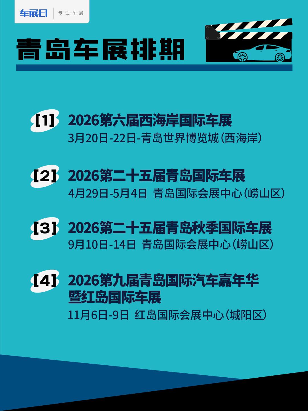 2026青岛车展时间排期。2026年青岛将举办多场车展,目前已定档的有四场。西海岸国际车展将于3月20至22日在青岛世界博览城举办;青岛国际车展将于4月29日至5月4日在青岛国际会展中心举办;青岛秋季国际车展9月10日至14日在青岛国际会展中心举办;红岛国际车展在11月6日至9日在红岛国际会展中心举办。【来自懂车帝车友圈】