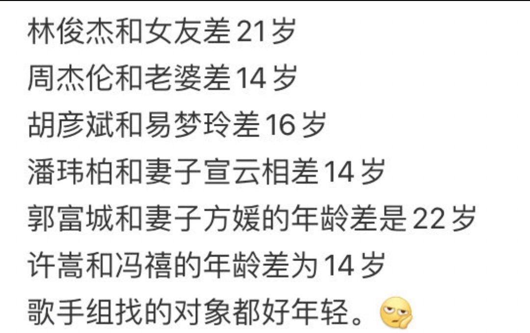 华语乐坛“老少恋”直接砸脸上。 44岁林俊杰在妈70大寿全家福里,公开了自己的小女友,被网友发现,疑似是23岁网红七七! 这21岁年龄差,网友笑称“老牛吃嫩草”,扎心了老铁! 但要说这是孤例? 错了!周杰伦31岁追17岁昆凌,胡彦斌38岁恋22岁网红,许嵩34岁娶20岁主持人,个个把“老牛吃嫩草”玩成日常。 其实说白了,不就是某些中年男人的青春梦嘛! 找个年轻女孩,图的就是那份活力和纯粹,哪怕被吐槽,依然挡不住人,那就是真爱。