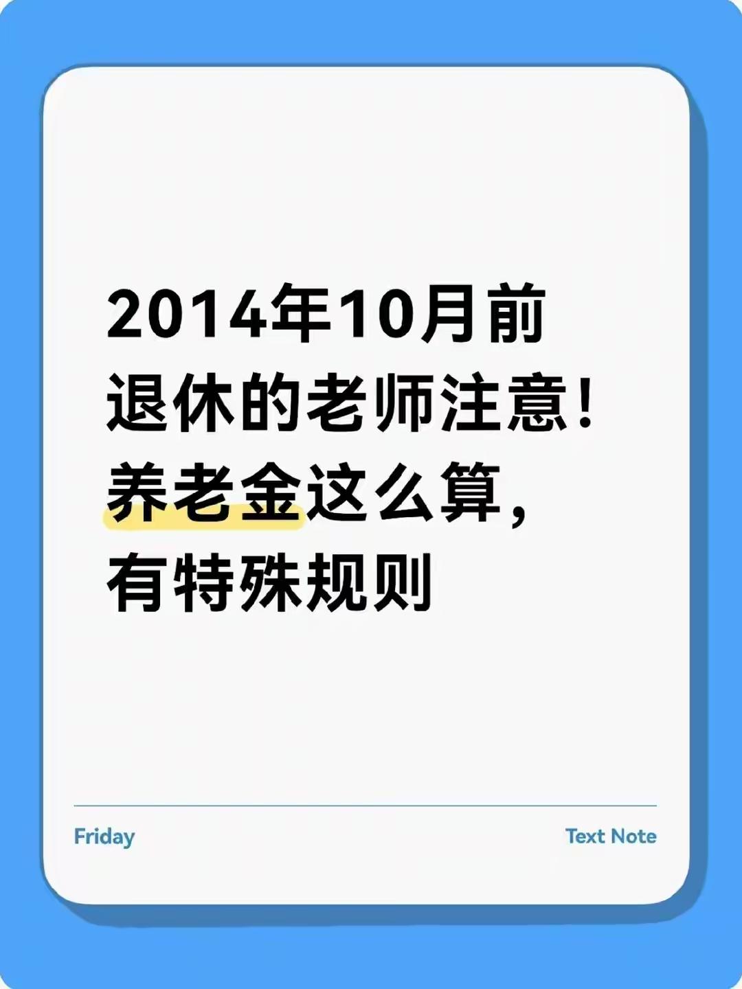 2014年10月前退休教师:养老金每月差数千元?特殊核算规则搞懂,钱一分都别少拿 2014年10月是机关事业单位养老保险改革的“分水岭”,改革前退休的教师,养老金核算有专属的特殊规则,不少人因为没摸透这些规则,要么算错自己的养老金金额,要么错过补贴申领,每月养老金比政策规定的少拿几百甚至上千元。今天就把2014年10月前退休教师养老金的核算规则、差额原因和维权办法说透,帮退休教师们搞懂自己的养老金到底该怎么算。 一、先明确:“老人”养老金按老办法算,核心看职称和工龄 2014年10月前退休的教师属于养老保险改革中的“老人”,养老金按老办法核算,和改革后退休的教师用的是两套完全不同的规则,核心就看两个关键点: 1. 退休前的基本工资:以退休时的岗位工资、薪级工资为基数,这是养老金核算的核心,比如高级教师的岗位工资比中级教师高,养老金基数自然更高; 2. 工龄对应的计发比例:工龄越长,计发比例越高,工龄满35年按90%计发,满30年按85%计发,满20年按80%计发,这个比例是国家明确的硬性规则。 举个实际测算:某高级教师2013年退休,岗位工资+薪级工资共5000元,工龄40年按90%计发,基础养老金就是4500元,再加上教龄补贴、生活补贴,每月实际能领6000元左右。这里要纠偏:不是工龄相同的教师养老金就一样,职称不同导致的工资基数差异,会直接拉开养老金差距。 二、别踩坑:这3个特殊规则,错一个就少领养老金 2014年10月前退休教师的养老金核算,有3个容易被忽略的特殊规则,少算一项都可能吃亏: 1. 教龄补贴单独核算:教龄补贴不是算在基本工资里,而是按实际教龄额外发放,多数地区每满1年教龄每月补10元,教龄30年就能多领300元,很多学校会漏算代课、支教的教龄,导致补贴少发; 2. 地区附加津贴不能少:经济发达地区会给退休教师发地区附加津贴,比如长三角、珠三角的部分城市,每月能额外补500-1000元,这笔钱由地方财政承担,不属于国家统一的养老金范畴,但也是合法福利; 3. 养老金调整挂钩工龄和职称:每年的养老金调整中,除了定额调整,挂钩调整会向长工龄、高职称教师倾斜,比如高级教师比中级教师多涨50元,工龄40年比30年多涨30元。 还有人以为“退休后养老金就固定了”,忽略了每年的调整政策,结果没及时核对涨幅,白白少拿了调整后的养老金。 三、觉得养老金算错了?按这3步复核准没错 如果发现自己的养老金核算有问题,比如工龄算少、补贴漏发,按这3步操作就能找回差额: 1. 查档案核信息:带身份证、退休证去原学校人事科,调取退休审批档案,重点核对教龄、职称、工资基数等关键信息,确认是否有记录错误; 2. 找教育局算明细:向当地教育局人事股申请打印养老金核算明细,对照老办法的核算公式,自己先算一遍,看是否有参数错误; 3. 提复核申请:发现问题后,填写《养老金待遇复核申请表》,附上档案证明材料,提交给当地社保局养老保险科,审核通过后会从退休当月补发差额。 若不清楚具体的核算公式和政策,可拨打12333人社服务热线,或去当地社保局的退休人员服务窗口现场咨询,工作人员会手把手教你核对。 其实2014年10月前退休教师的养老金规则,是国家为了保障“老人”待遇制定的,只要摸透规则、核对好信息,就能拿到应得的养老金。作为几十年扎根讲台的教育工作者,这份养老保障是应得的回报,千万别因为嫌麻烦就放弃核对,该拿的钱一分都不能少。