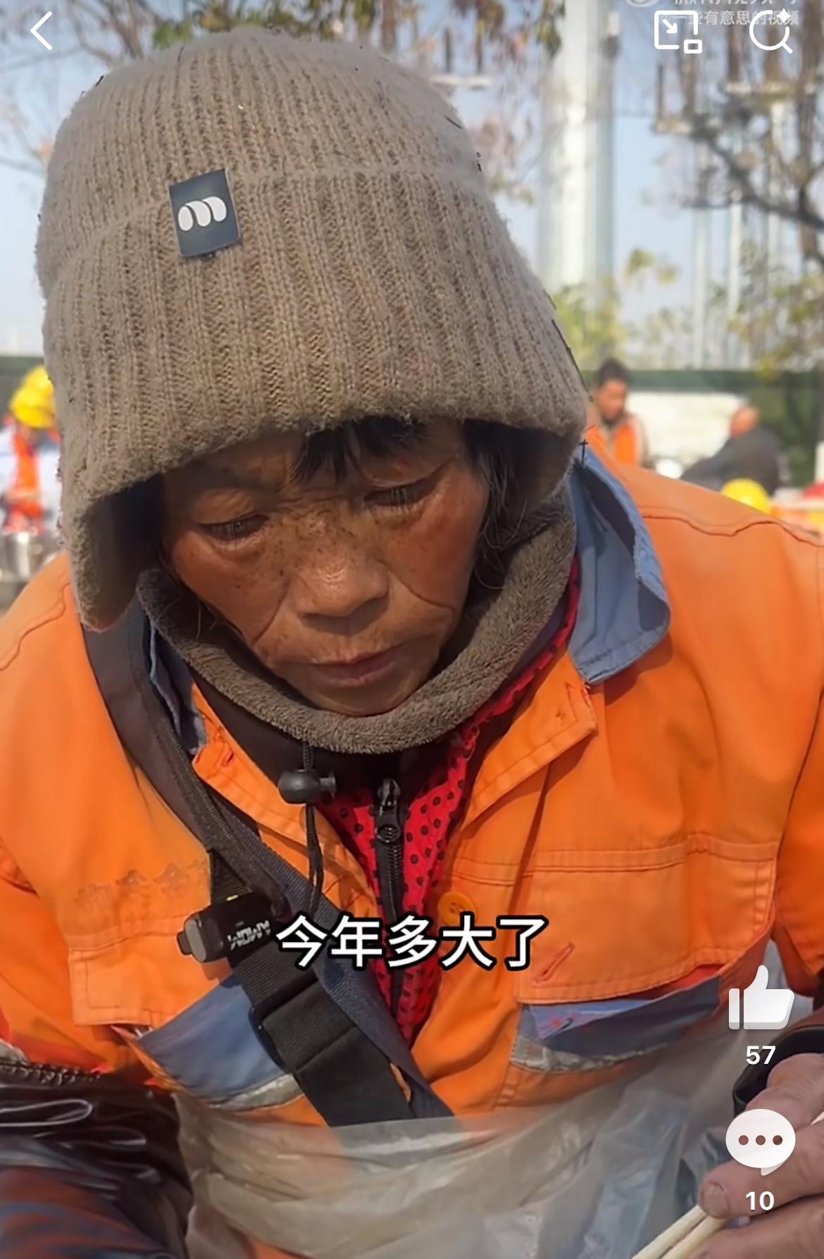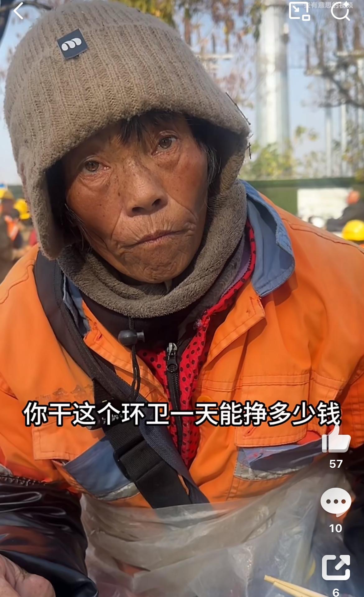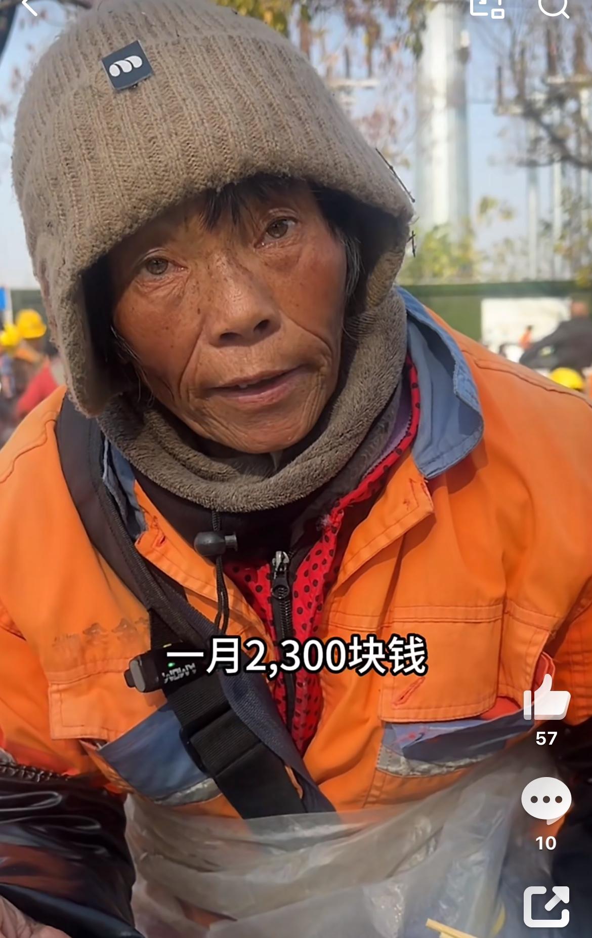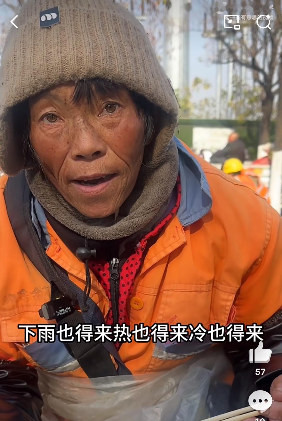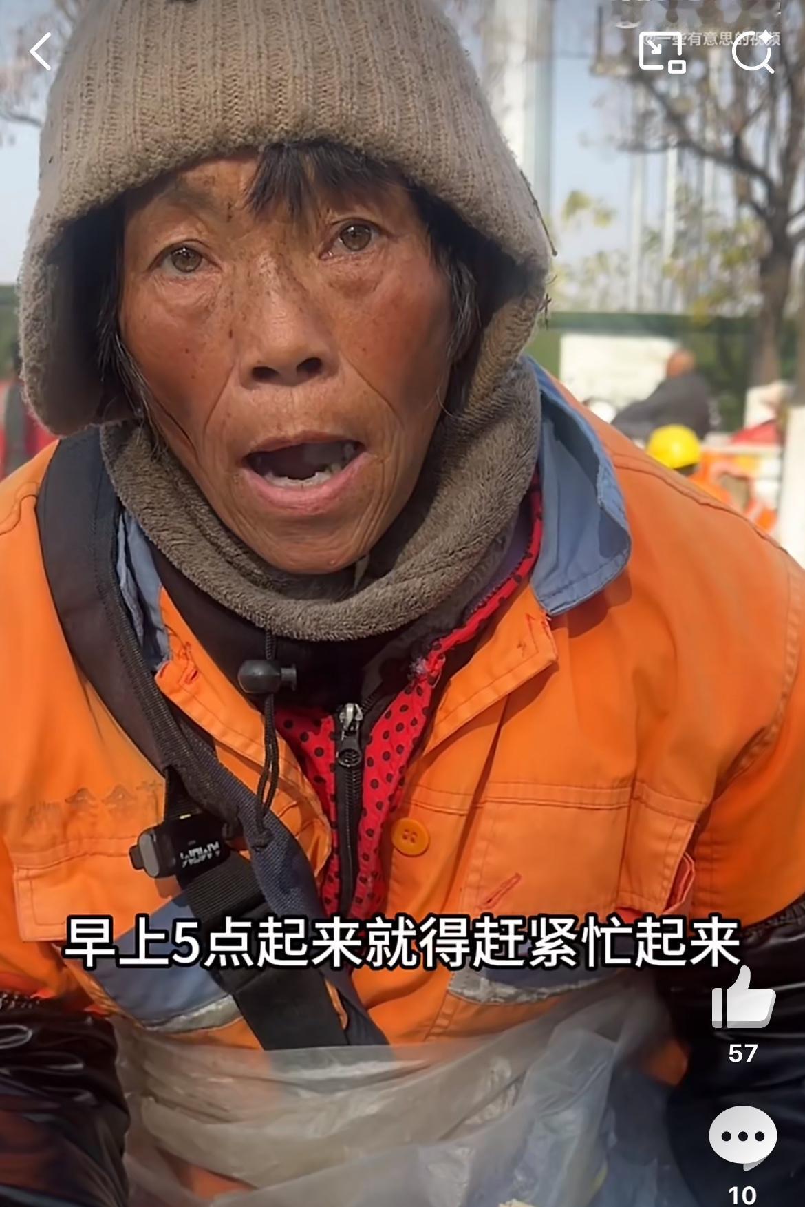 这个脸上写满沧桑的大妈才58岁,是一名环卫工人,一个月2300工资,几乎没有休息,每天早晨五点到下午五点半收工。她说不干,就没有活路。问她幸福吗?她直言现在很苦。5岁没妈,6岁没有爹,和一个妹妹相依为命,靠讨饭养妹妹,都是讨到先给妹妹吃,再自己想办法。环卫工人 环卫工阿姨