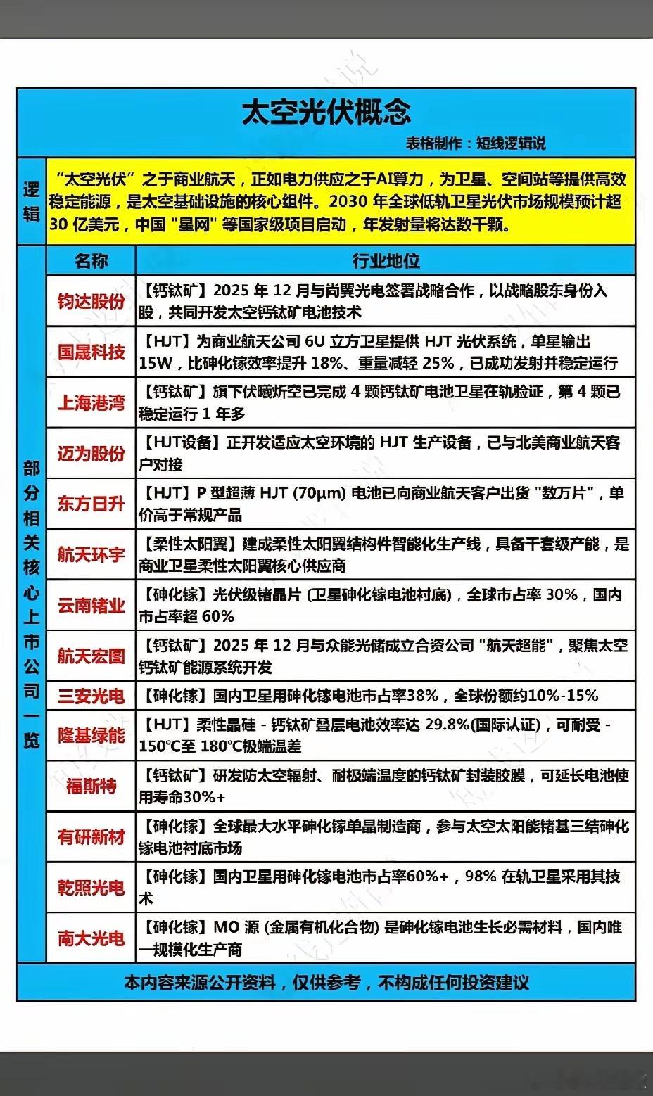 12月30日,周二A股这个板块有望大涨!!!太空光伏之于商业航天,正如电力供应之于AI,为卫星、空间站等提供高效能源,是太空基础设施核心组件,2030年全球低轨卫星光伏市场规模预计超30亿,重点关注:钧达股份、国晟科技、迈为科技!!!股市分析