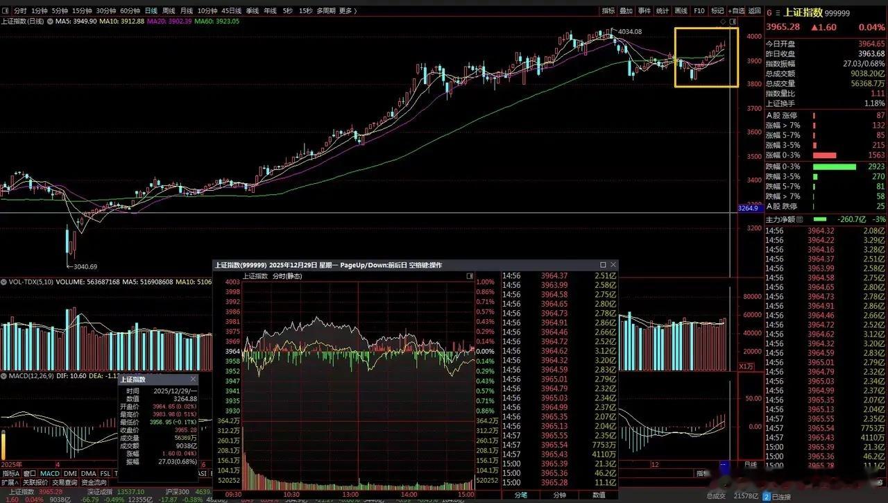 九阳神功惊现A股!9连阳,近两日成交重回2万亿,市场量价齐升,要突破4000?2025年还有两个交易日,照这种走势拿下4000甚至刷新高点也不是完全没有可能。3000多只股票是绿的,盘面上明显有一股力量利用指数制造一种虚假繁荣,其实大多数人的账面上很难看,只是给量化做了嫁衣。个股涨幅超10%的近百家,但跌幅超10%的也有30家,指数9连阳,个股大分化,这种行情真的不好玩!