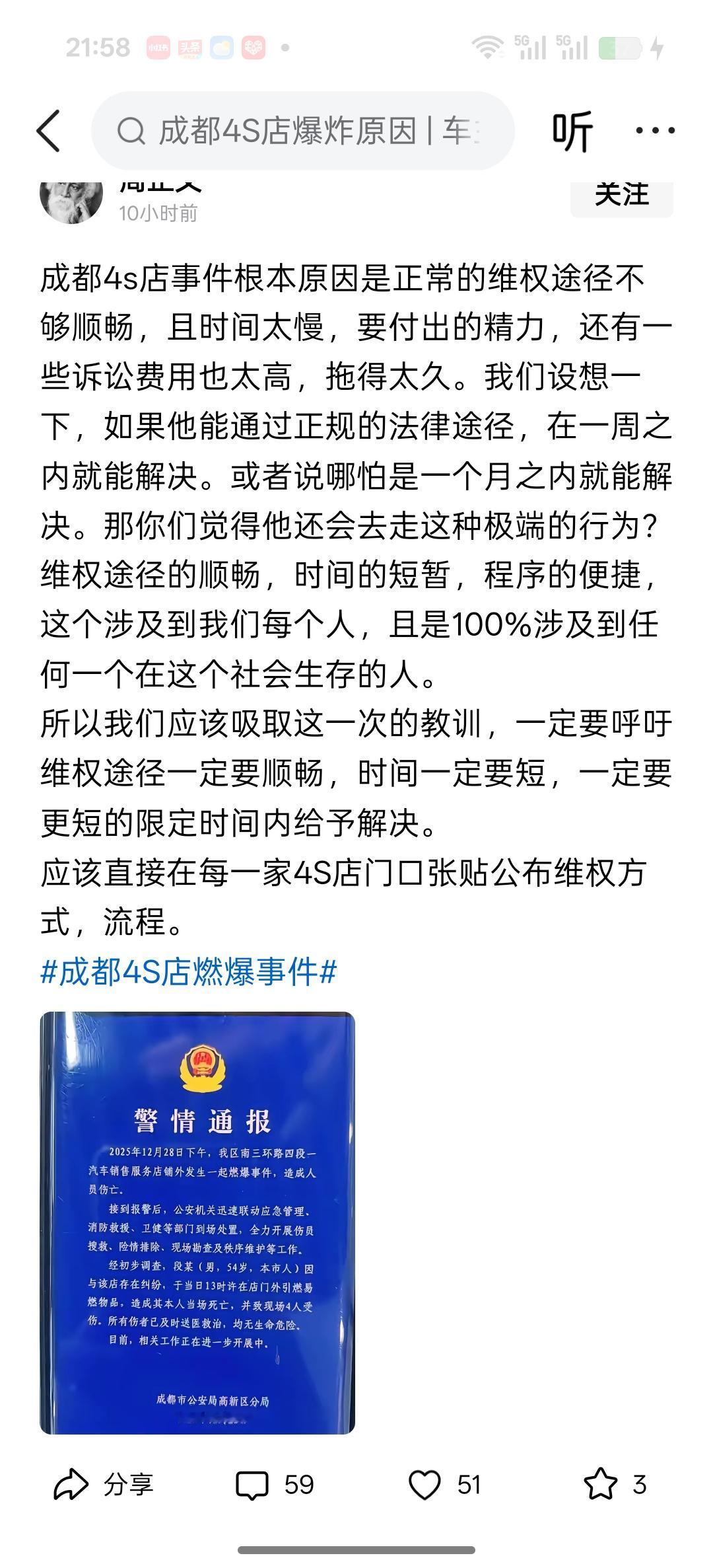 悲剧已经发生,我们更该反思:4S店需摒弃店大欺客的傲慢,监管部门应强化行业规范,而每个消费者都要记住:维权的初衷是保护自己,而非毁灭自己。极端行为只会让维权变味,让家人承受无妄之痛。