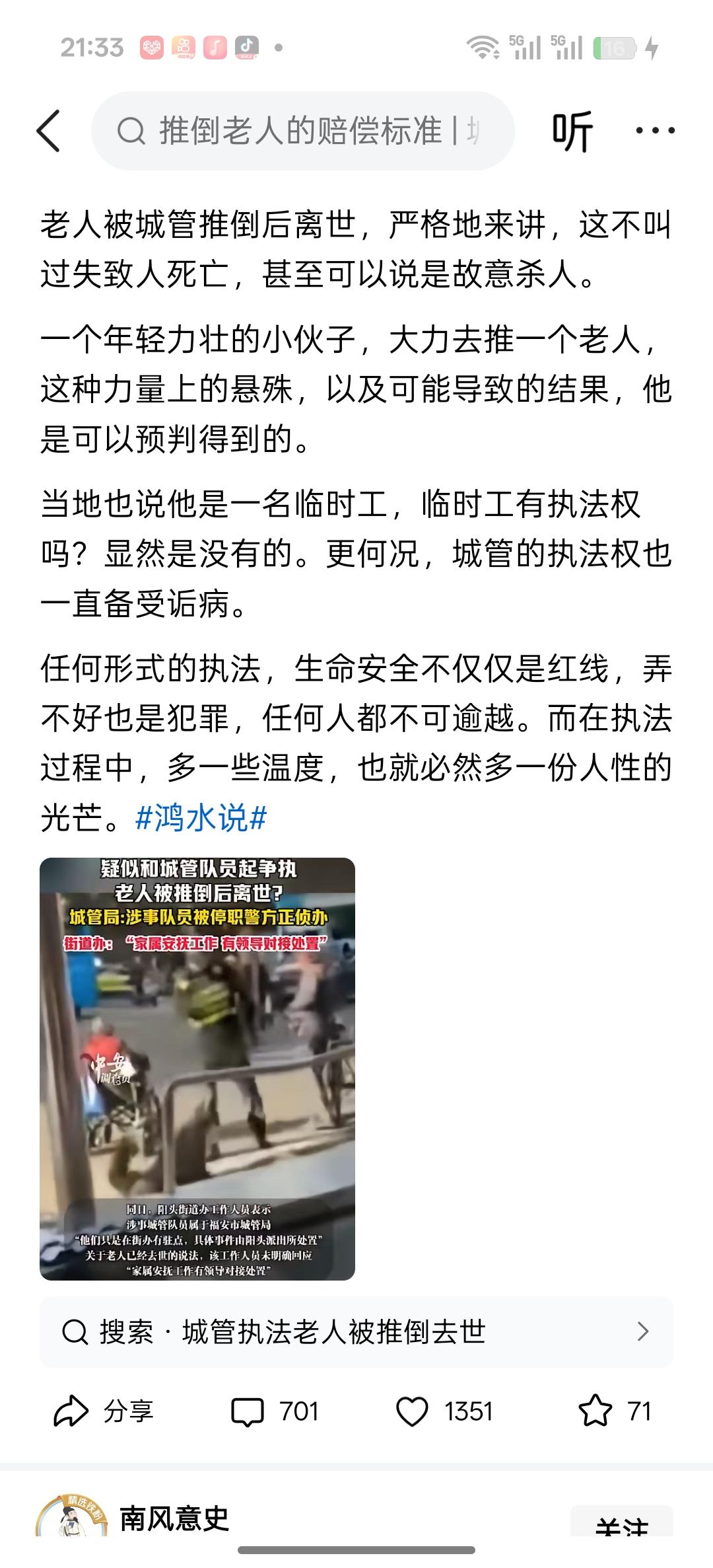 既然是临时工,那么该名城管就没有执法权。既然没有执法权,那么该名城管就不能执法,也就不存在执法行为!在明知自已无执法权,自已的行为也不是执法行为的情形之下,也明知自已的行为会造成他人人身伤害,而执意用力撞击老年人,导致他人伤亡,这种行为应该定性为涉嫌故意杀人!