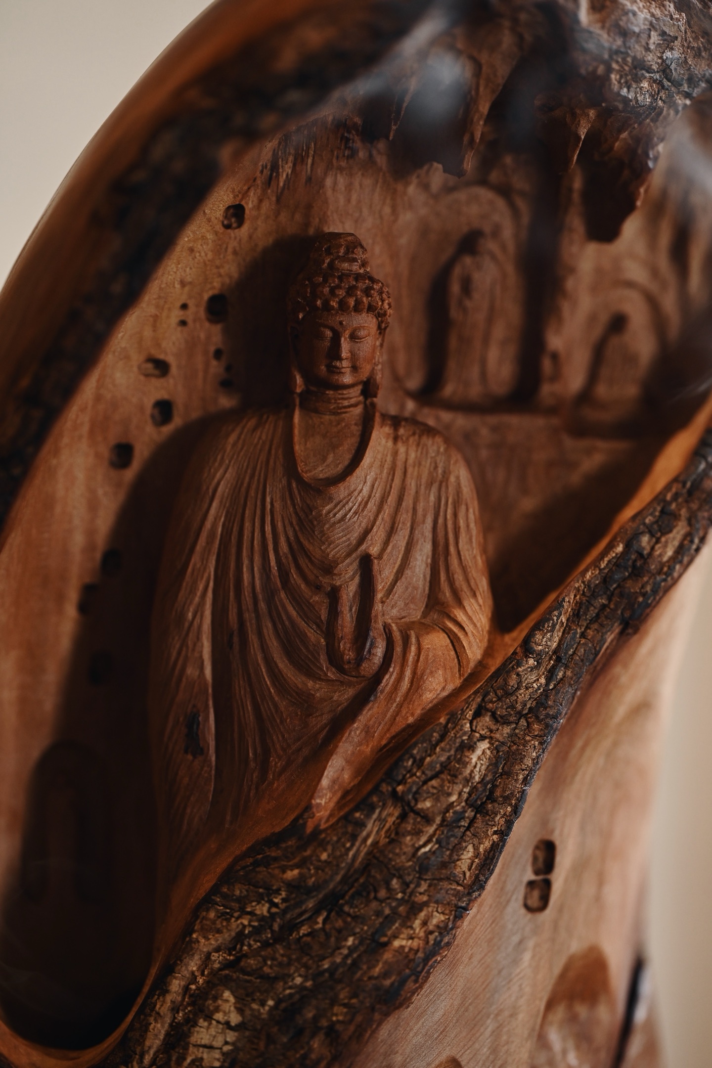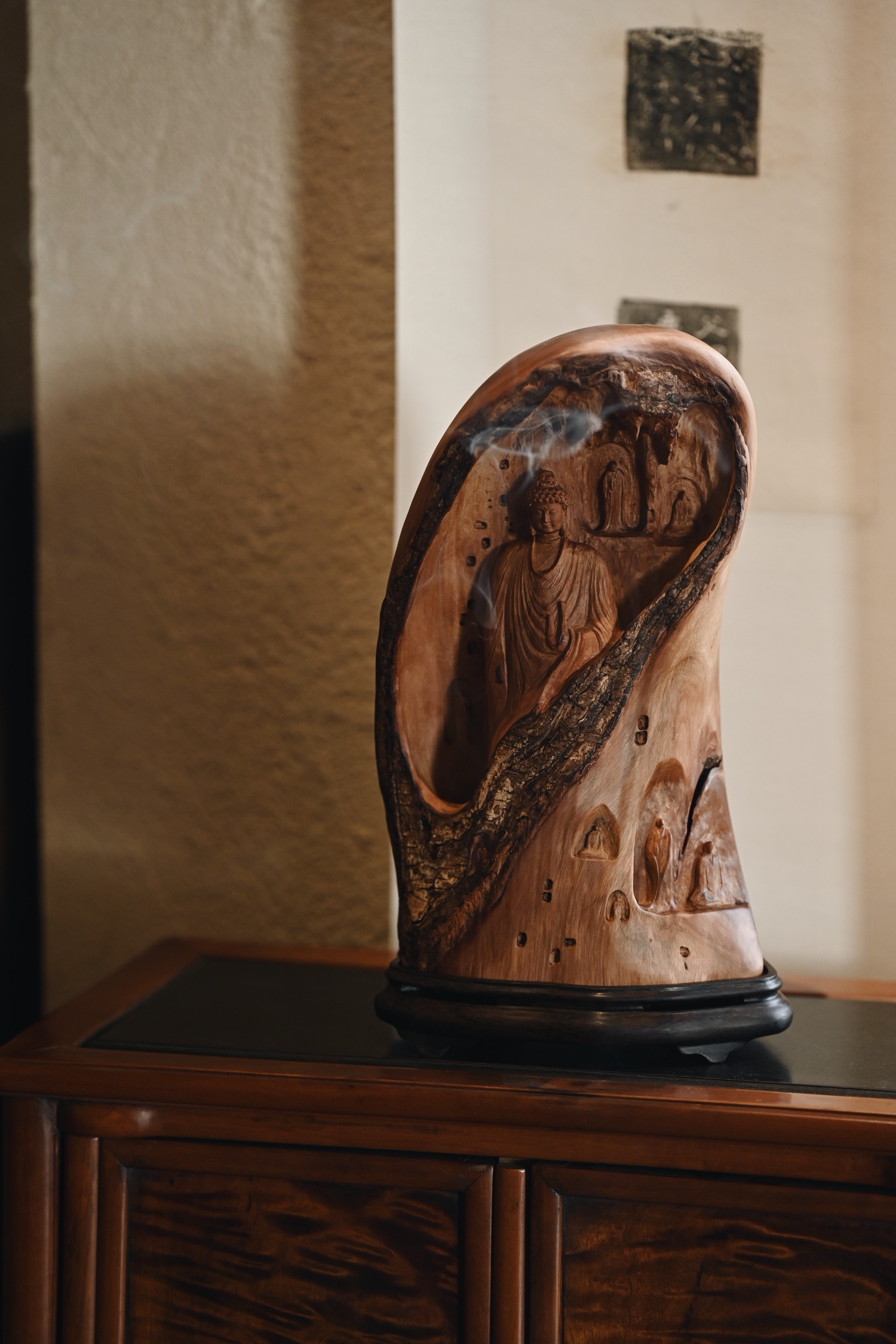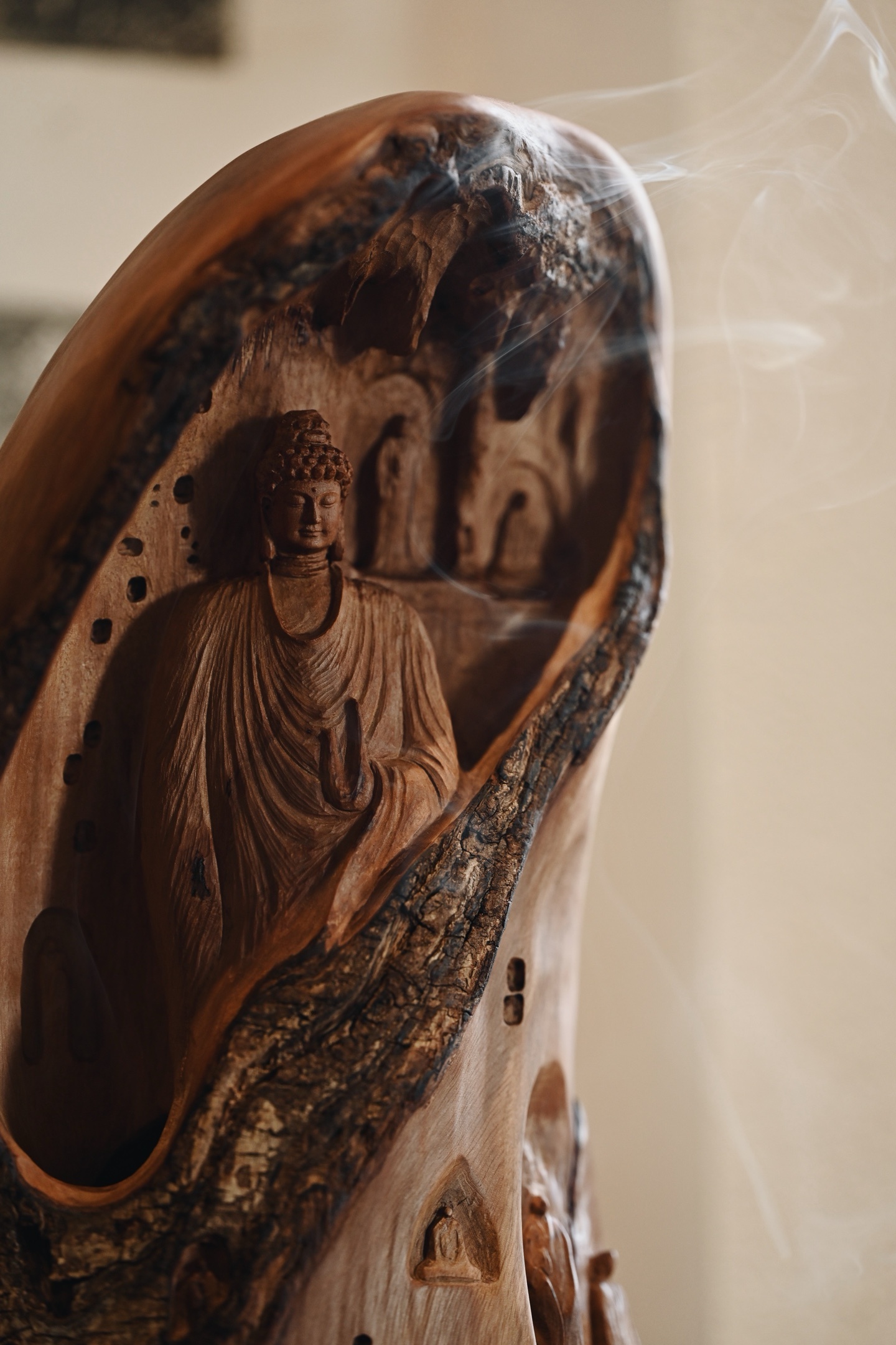 荔枝木 | 佛窟 香炉取荔枝木肌理之温,摹千年佛窟龛影之静,雕刻古拙有韵,燃一盘香,青烟从佛窟间缓缓漫出,禅意隽永。15.5*12.5*27cm 1542g
