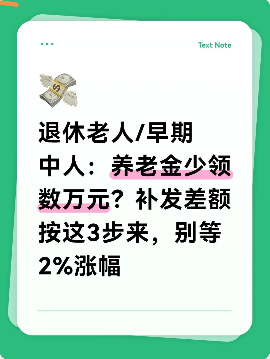 2014年10月养老保险改革后,早期“中人”和退休“老人”的养老金出现差额,有人每月少领数百元,累计下来少拿数万元,相比之下,2%的养老金涨幅根本填补不了这笔缺口。不少退休人员呼吁补发少发的养老金,而非期待微薄的涨幅,这一诉求戳中了改革过渡期养老金核算的痛点。今天就把养老金差额的成因、补发规则和维权办法说透,帮大家搞懂如何拿回该得的养老金。 一、先搞懂:差额不是政策不公,是过渡期核算规则导致的 很多退休人员觉得“少发养老金是政策偏向”,其实核心原因是改革过渡期的新老办法对比核算规则: 1. 2014年前退休的“老人”:按老办法核算养老金,基数是退休时的工资标准,后续仅随养老金整体调整上涨; 2. 2014-2024年退休的早期“中人”:实行“保低限高”,新办法核算低于老办法就按老办法发,高于老办法的部分分年度按比例补发(比如2015年补10%、2016年补20%),直到2024年补满100%。 但实际执行中,部分地区因系统升级、档案核对延迟,导致早期“中人”的差额补发不及时,甚至漏算,这才出现“每月少领钱”的情况,并非政策刻意克扣。 二、别误解:2%涨幅填不了缺口,补发才是关键 退休人员对2%涨幅的期待不高,核心是这笔涨幅的实际作用太小: 1. 涨幅测算:若养老金基数5000元,2%的涨幅仅100元/月,一年才1200元,对于累计少领数万元的人来说,无异于“杯水车薪”; 2. 补发的重要性:早期“中人”的新老办法差额少则每月数百元,多则上千元,补发后能一次性补齐数年的差额,这才是解决养老待遇差距的核心。 这里要纠偏:不是反对养老金上涨,而是相比涨幅,退休人员更在意被拖欠的差额,毕竟这是改革政策明确的应得待遇。 三、想补发养老金,按这3步操作准没错 如果发现自己的养老金存在差额未补发,按这3步走,能有效维权: 1. 查核算明细:带身份证、退休证去当地社保局,打印《养老金核算表》,重点核对新老办法的测算数据、补发比例和金额,确认差额所在; 2. 补全档案材料:若因档案不全导致核算延迟,需找原单位人事科补充工龄、职级、工资等证明材料,提交给社保局复核; 3. 提补发申请:填写《养老金差额补发申请表》,附上核算明细和档案材料,社保局审核通过后,会从退休当月开始补发差额,一般30个工作日内到账。 若遇到社保局拖延或驳回申请,可拨打12333人社服务热线投诉,或向当地人社部门的信访科反映情况,借助官方渠道推动问题解决。 其实养老金差额补发是改革政策的应有之义,退休人员不必因担心“流程复杂”而放弃维权。这笔钱是养老的重要保障,只要符合政策条件,就该主动去争取。与其坐等涨幅,不如先把被拖欠的差额要回来,让退休生活更有底气。