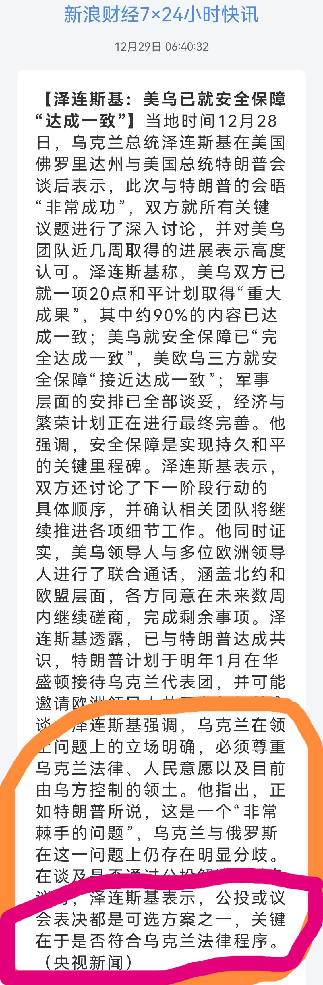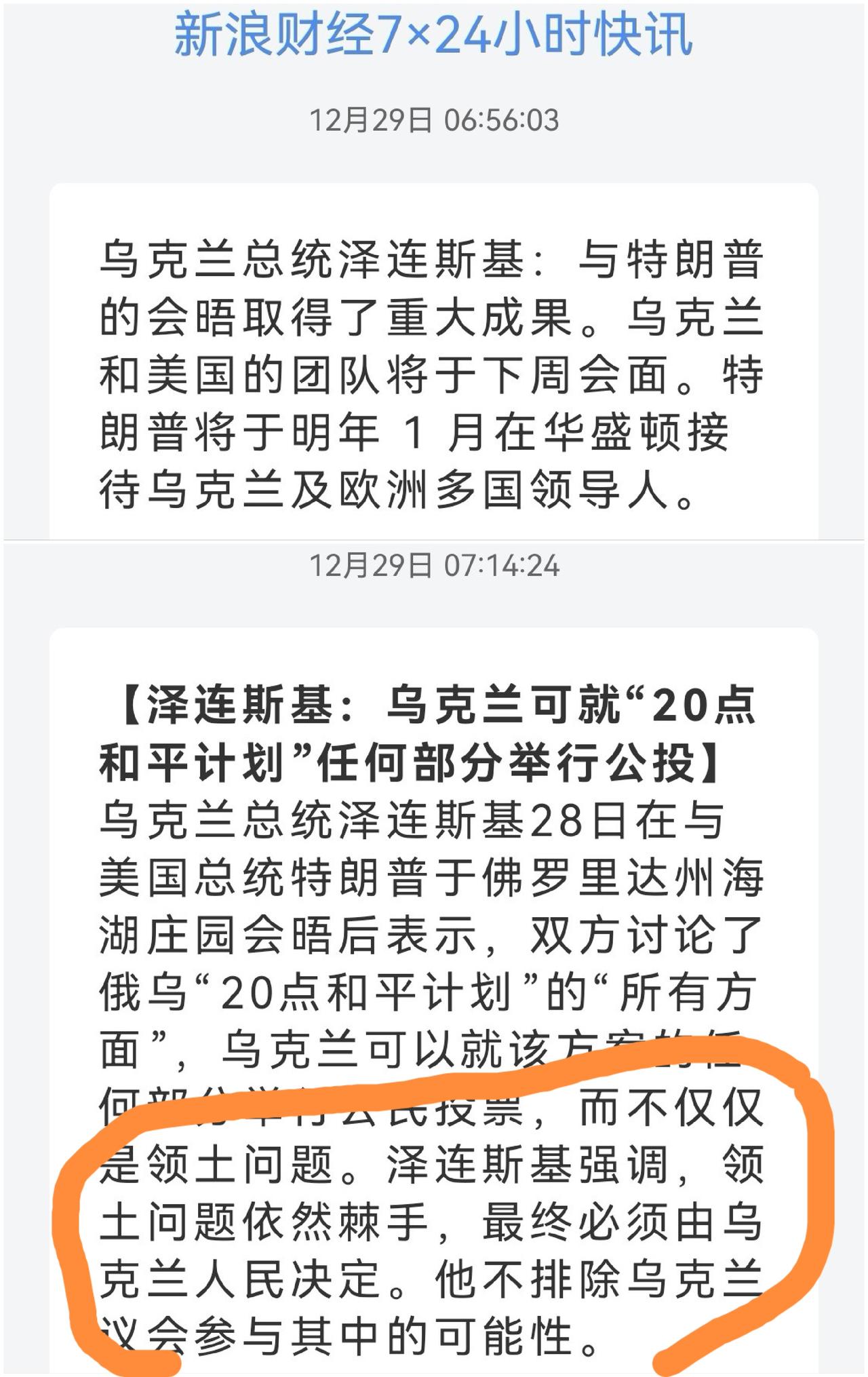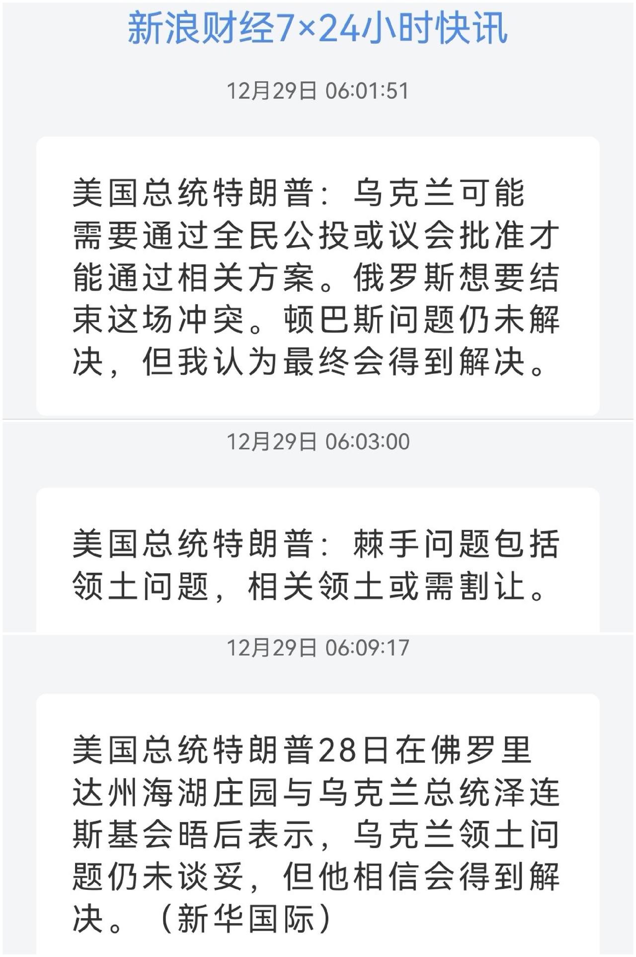 俄乌和谈进展~美国教训 小泽面对现实 美国特朗普:我与泽连斯基举行了一场十分成功的会晤。 (特朗普与泽连斯基未谈妥领土问题) 美国特朗普:棘手问题包括领土问题,相关领土或需割让。 乌克兰可能需要通过全民公投或议会批准才能通过相关方案。顿巴斯问题仍未解决,但我认为最终会得到解决。 乌克兰泽连斯基:会晤取得了重大成果。 双方团队将于下周会面。明年 1 月在华盛顿乌克兰及欧洲多国领导人与美国会谈。 乌克兰泽连斯基:乌克兰可就"20点和平计划"任何部分举行公投,而不仅仅是领土问题。 领土问题依然棘手,最终必须由乌克兰人民决定。他不排除乌克兰议会参与其中的可能性。 乌克兰泽连斯基:美乌双方已就一项20点和平计划取得"重大成果";美乌就安全保障已"完全达成一致",美欧乌三方就安全保障"接近达成一致";军事层面的安排已全部谈妥。 经济与繁荣计划正在进行最终完善。 多嘴:总算认清现实,领土问题摆上台面,要不直接签协议,要不你通过议会或者全民公投,反正你必须解决。 特朗普主谈“领土”,因为想回避不可能,大鹅不同意。那么无可奈何的一方只能谈“安全保障”和“重建计划”了。 安全保障又是另一个大难题:因为弄不好就变成北约第五条款共同防御,那就直接相当于加入北约。 志愿联盟共同驻军,80万军队,这就相当于再度武装,休养生息,而且后边还有靠山了~,说是保障安全,其实再次开战更有底气~,谁都不会同意。 经济和繁荣计划?8000亿?有这8000亿自己花不行吗?让你繁荣?且不说美国优先的特朗普,欧洲呢?有这8000亿他不如建设他自己。给你?你完成了任务吗?还被大鹅推进了那么多~~ 美国特朗普:俄罗斯将协助乌克兰重建,其亦希望助力乌克兰实现发展。普京在对乌援助方面十分慷慨,包括以低价供应能源。俄罗斯将参与乌克兰的战后重建工作。 美国总统特朗普:今日已与泽连斯基、普京就扎波罗热核电站问题展开磋商。 多嘴:大鹅将帮助乌克兰重建?现在大鹅是“拆迁队”,后期他还要做“开发商”? 连环坑~?不借鉴某国以前的经验吗? 就扎波罗热核电站展开磋商,现在核电站大鹅占领和掌控,他会吐出来吗?不过特朗普卖了这么大的力气,给点干股也是应该的,至于乌方,省省吧,你已经失去了,不过可以卖给你电力,毕竟25%的电力依靠他~~ 不管怎么说,特朗普不想给你找8000亿,能找的话他也想自己花~~ (图片源自网络侵权告知删除)