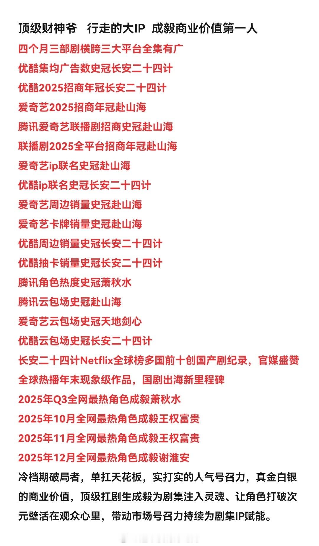 成毅拿下优酷2025招商年冠,爱奇艺2025招商年冠,腾讯爱奇艺联播剧招商史冠,四个月横跨三大平台全集有广的含金量。商业价值第一人☝