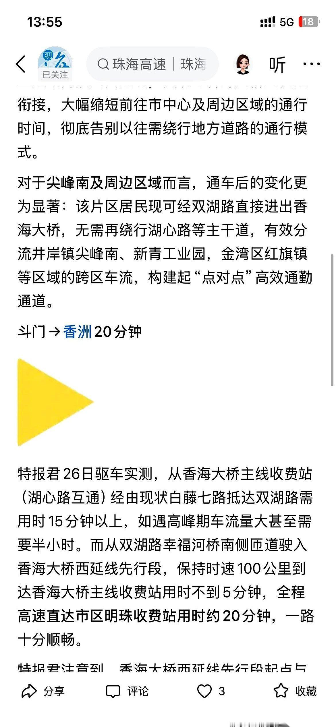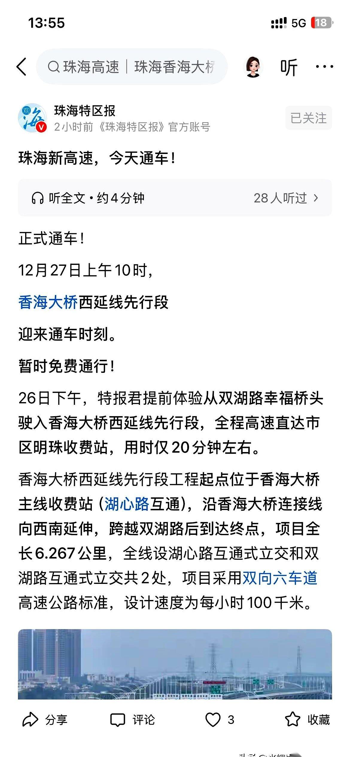 每天能多睡20分钟,你知道这是什么概念吗? 意味着早上可以多从容地吃个早餐,意味着堵在路上的烦躁,一下子就被抚平了。 这一切,就因为香海大桥那条新路通了。 今儿早上第一次开上去,说实话,有点不习惯。 六车道,一脚油门下去,那叫一个丝滑。感觉导航小姐姐的语音都快跟不上我的车速了。 以前在老路上挪,听歌能听完一整张专辑;现在,一首歌还没放完,嘿,快到了。 这种感觉挺奇妙的。 你好像突然意识到,你生活的这个城市,根本不是什么慢悠悠的小老头,它一直在偷偷地长个儿,偷偷地变强。 这哪是修了条路啊。 这简直就是把时间,原封不动地还给了我们这些天天在路上奔波的打工人。 你看着这桥,这路,就像这个城市的动脉。修得越宽,跑得越顺,整个城市的心跳就越有劲儿。 以后谁再说珠海小,我就跟他急。 这座城市,正用它的“基建速度”,把所谓的“远方”,都给你拉到眼前。 有点骄傲,真的。
