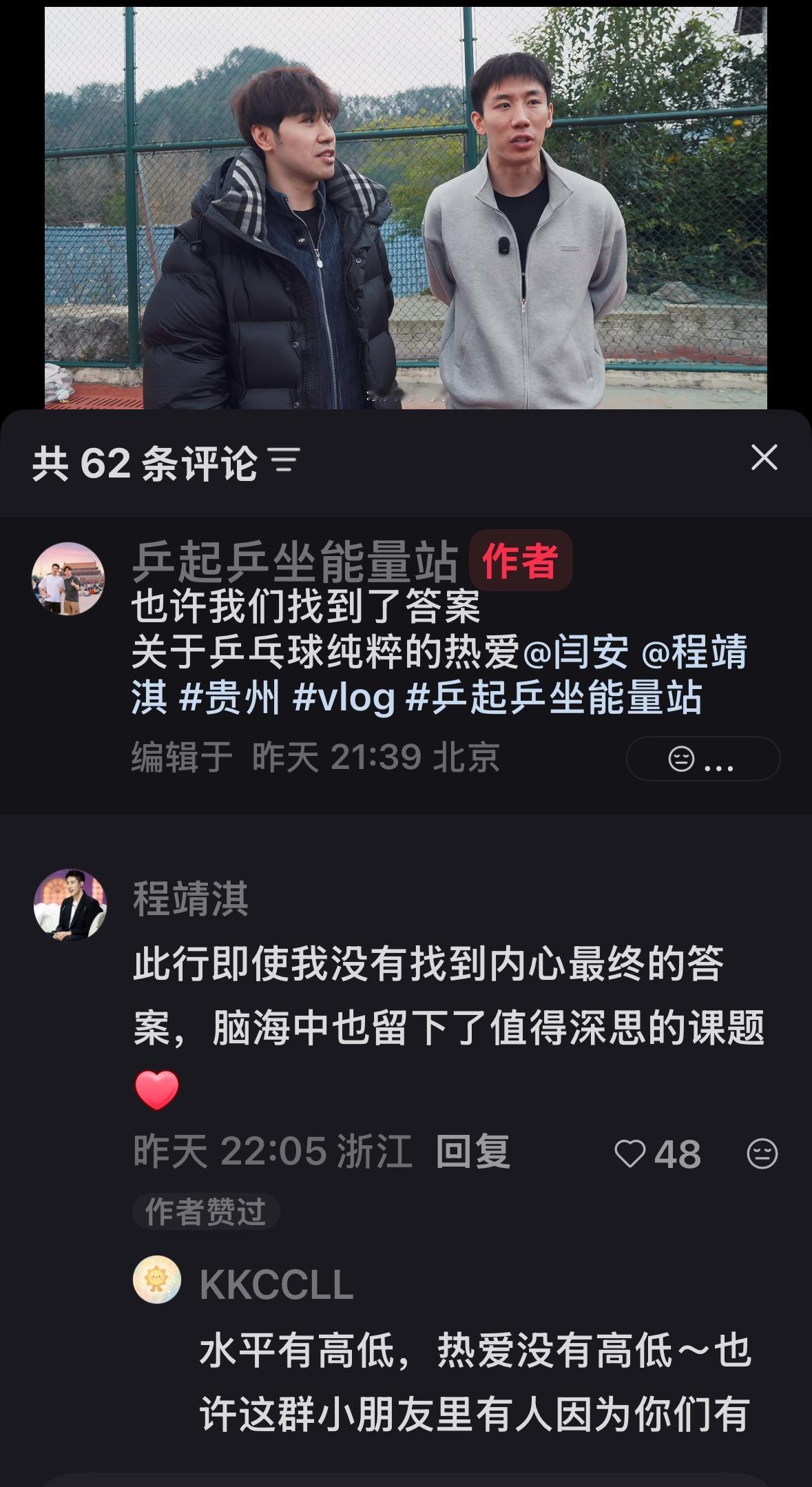 闫安 程靖琪到贵州做乒乓球公益推广—闫安说感谢孩子又让我体验到最纯粹的快乐! 闫安与程靖琪正在做着一件非常有 意义的事情,到大山深处推广乒乓球项目,回到最初的热爱, 贵州山区有的地方学校硬件设施 比较差,是你们给孩子们的心里 埋下乒乓球的种子! 看完之后, 心里有很多感触, 你们从未辜负自己的诺言, 脚踏实地的践行, 用自身的行动转化为更有价值的力量,让运动员的光芒照亮在每一个角落,必须为你们点赞👍! 这才是真正的乒乓球的另一种传承, 非常有意义的事情, 原来同一精神世界的圈是互相吸引的,最有价值的推广, 使乒乓球回到最初的热爱!