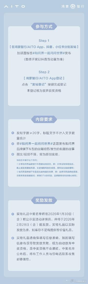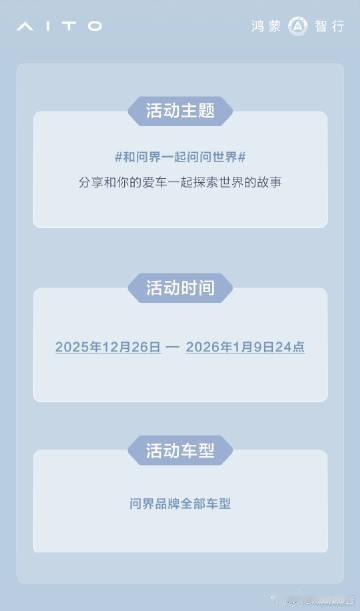 和问界一起问问世界车主故事征集温暖启幕,全系车型中,问界M5以精准操控与超长续航穿梭城市街巷,鸿蒙座舱与ADS智驾让日常通勤成为对生活的温柔追问。问界M7凭宽敞空间与稳健性能承载家庭期盼,在山海之间铺就从容旅途,智驾辅助消解长途疲惫。问界M8以途灵底盘与豪华配置兼顾家用与轻商务,让每一次奔赴都满含底气。旗舰M9则用全景智慧座舱、百变空间与高阶智驾解锁探索新可能,巨幕娱乐与灵活装载适配多元场景。从都市通勤到旷野漫游,从二人同行到三代同游,问界全系以“问”求索、以行作答,用科技实力与舒适体验,陪你在每一段旅程中探寻答案,把世界的精彩尽数收藏。汽场全开问界m5问界m9问界m8问界m7