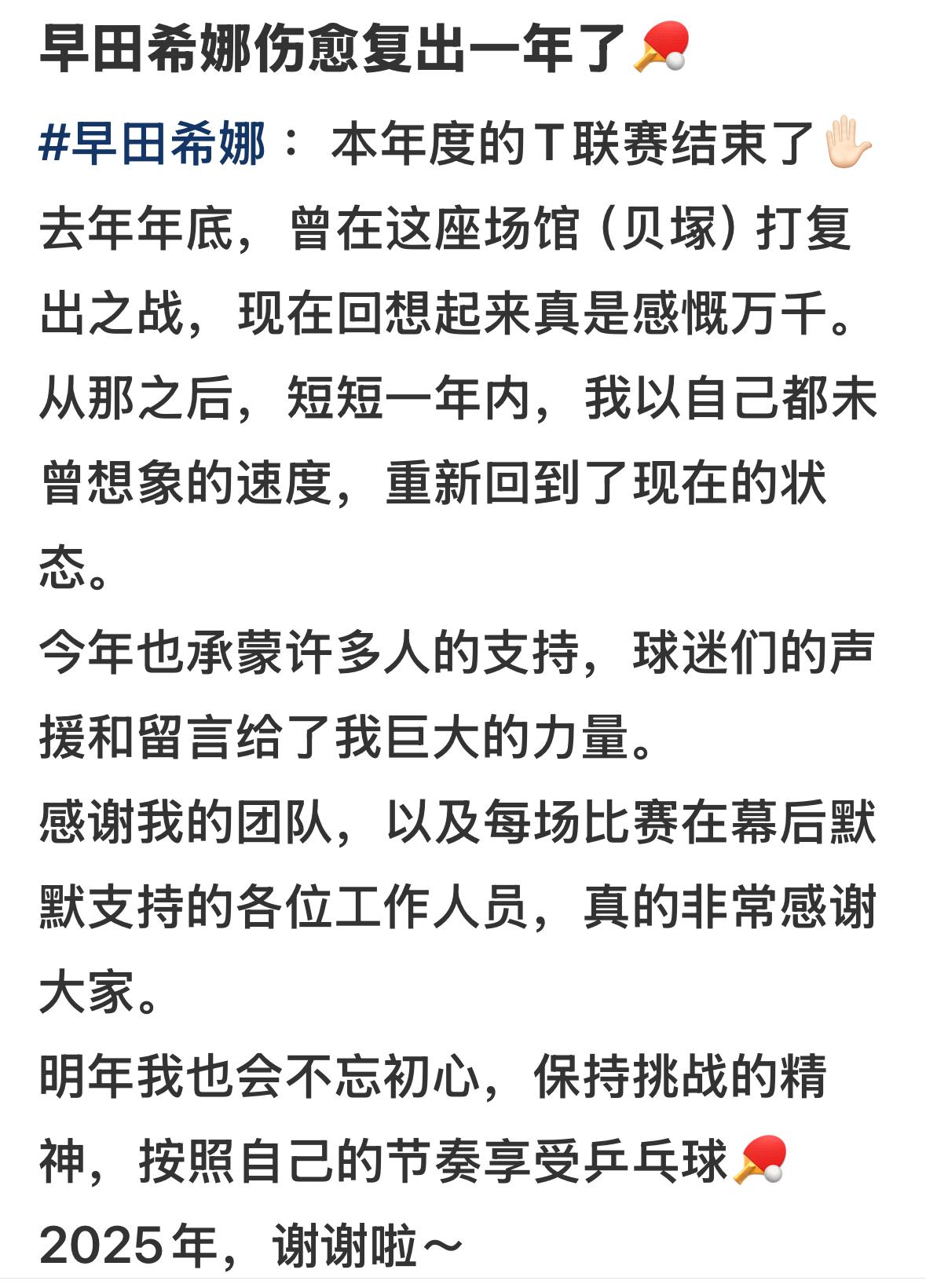 早田希娜总结2025:伤愈付出一年,重新回到状态,2026不忘初心,按照自己的节奏享受乒乓球🏓! 没办法, 伤病,技改, 是大多数运动员面临的难题, 早田希娜从巴黎奥运会伤退, 到状态恢复的不好, 从今年下半年状态慢慢好转, 从世界排名第五到奥运伤病后 不断退赛,跌出前十, 到现在又重新回到最初, 早田希娜的毅力还是很强大…… 2026年,希望国乒运动员都能 健健康康,毕竟健康是职业生涯 的前提,减少参赛次数, 使身体保持最佳状态, 受伤的几率会大大减少, 加油国乒!