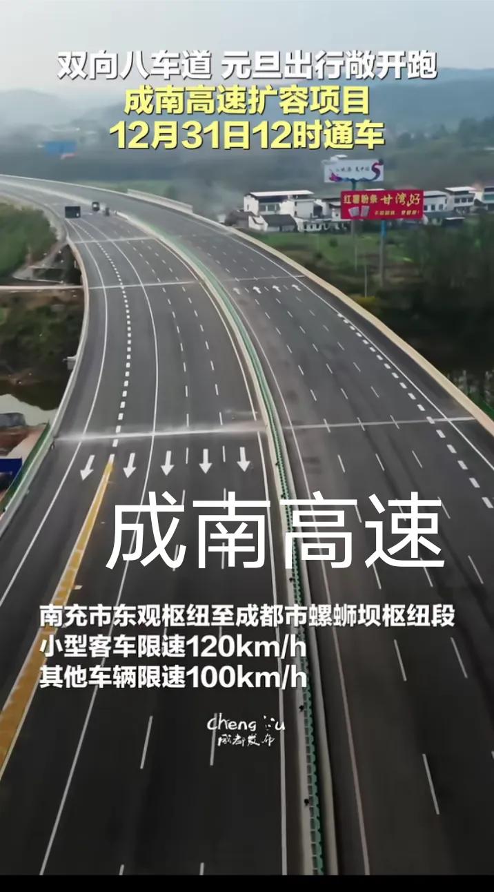 即将通车,G42沪蓉高速成都至南充段4改8扩容项目即将于明天(12月31日)12点正式通车,2026年元旦和春节成都开车来往遂宁和南充还有达州和广安岳池等地将更加便捷顺畅,南充第二绕城高速南段正式形成,成南高速扩容全长约240公里,大部分路段为4改8车道两侧加宽拼接方式,南充城区和大英城区段为新建复线方式,此次成南高速通车后将实行小客车和大货车分道行驶,全线大部分路段小客车限速120公里每小时,宋家沟隧道至永立隧道路段所有车辆限速100公里每小时(以实际限速提示牌为准),沿途部分收费站和停车区暂时不能开放,需要途经成南高速的司机朋友需要前了解收费站和停车区开放状态。